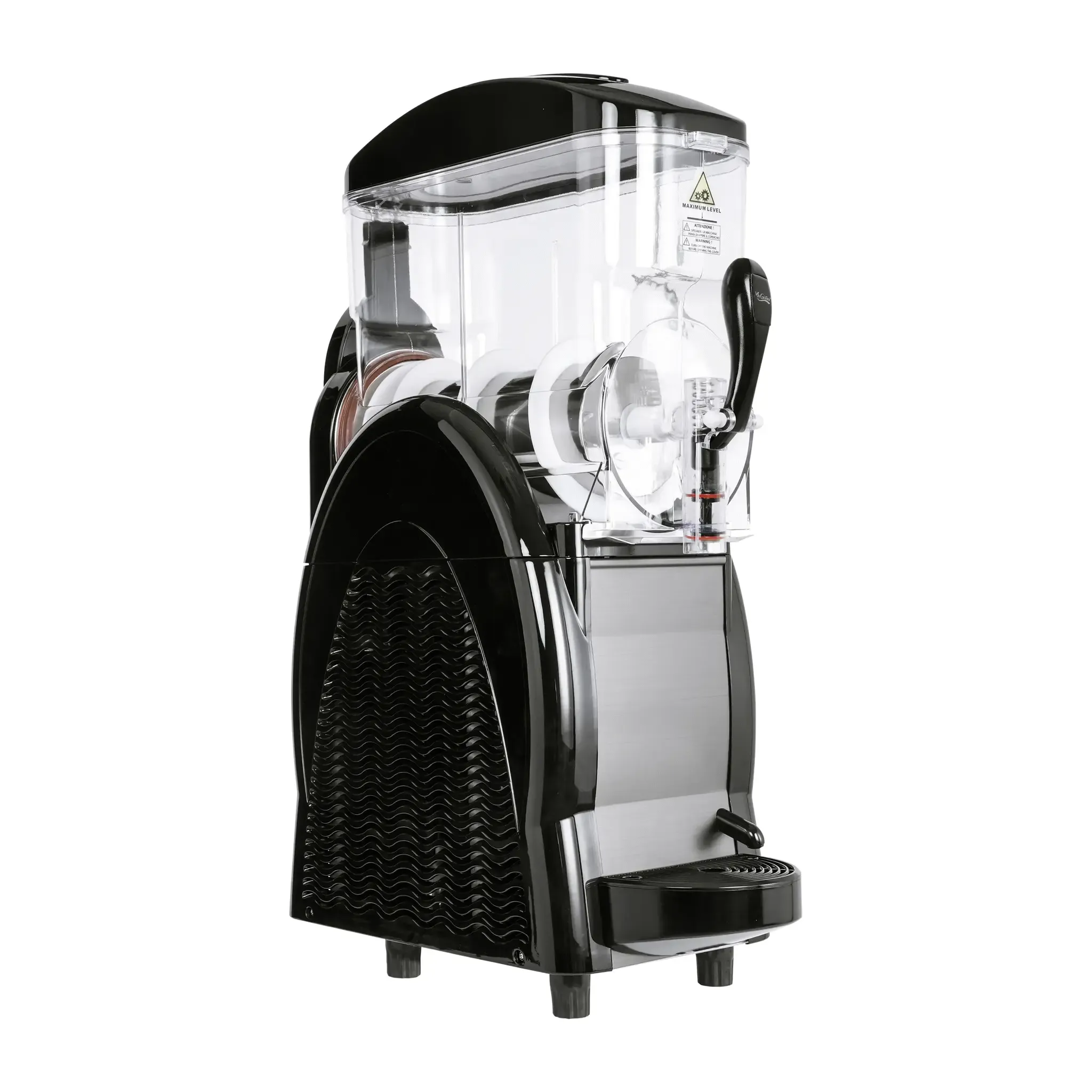 Upgrade your culinary gear with the Adcraft - Admiral Craft Equipment SGM-1 Frozen Drink Machine. This non-carbonated, bowl-type machine is perfect for commercial restaurant use. With its 3-gallon single hopper made of clear polycarbonate, you can easily monitor the contents. The continuous agitator system ensures a smooth and consistent texture, while the non-drip tap prevents messy spills. Cleaning up is a breeze with the removable drip tray. The built-in LED hopper lighting adds a touch of elegance to your establishment. Thanks to the adjustable digital thermostat, you can easily control the temperature to achieve the perfect frozen drink consistency. The stainless steel cooling cylinder and frame ensure durability and longevity. Powered by R404A refrigerant, this machine operates efficiently at 115v/60/1-ph, consuming only 500 watts. Upgrade your restaurant's beverage offerings with the Adcraft - Admiral Craft Equipment SGM-1 Frozen Drink Machine and impress your customers with delicious frozen treats.