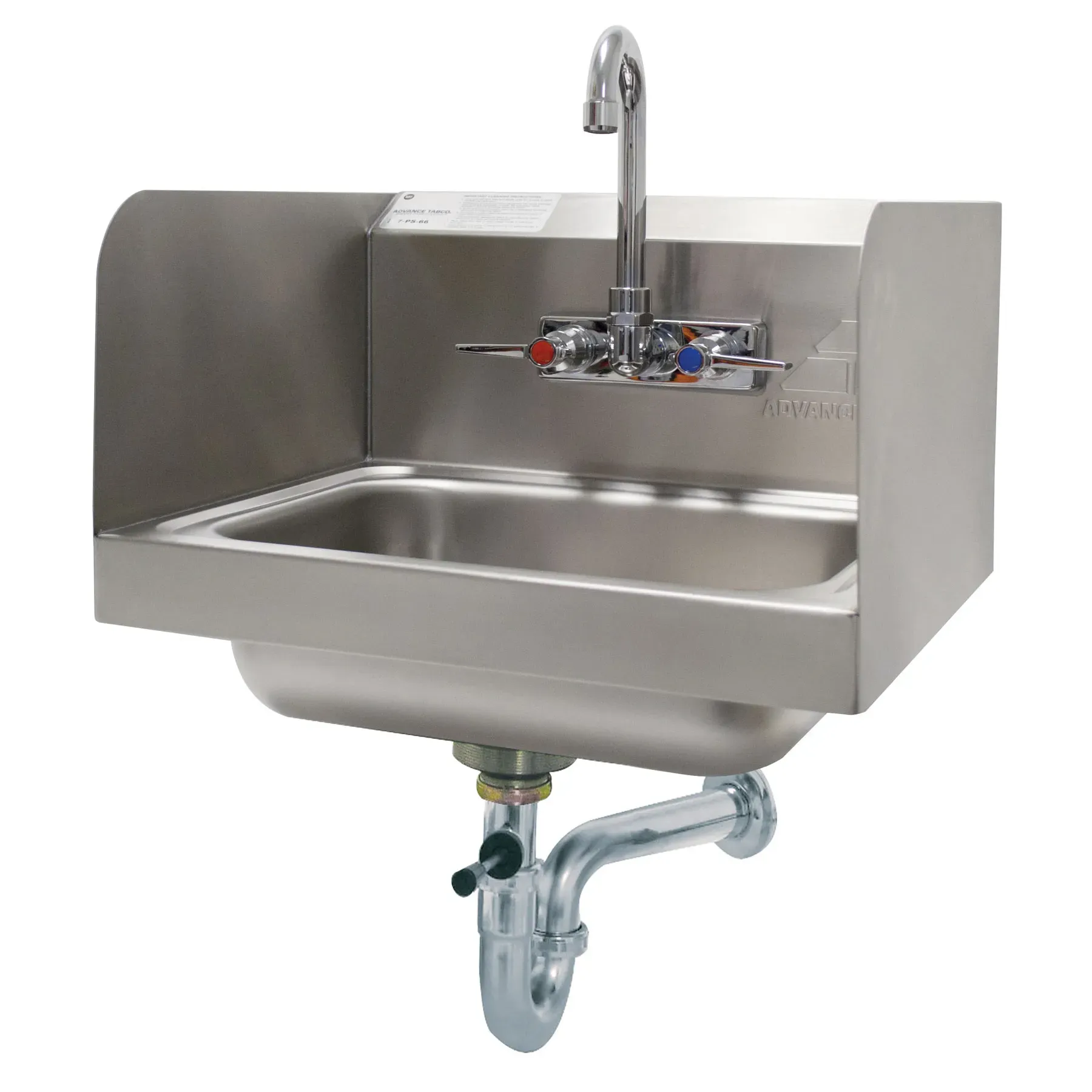 Achieve kitchen supremacy with the Advance Tabco, 7-PS-40 Hand Sink. This wall-mounted sink is designed to meet the rigorous demands of a commercial restaurant. Made from durable 20 gauge 304 stainless steel, it ensures long-lasting performance in a busy kitchen environment. The 14" wide x 10" front-to-back x 5" deep bowl provides ample space for handwashing, while the 7-3/4" high side splashes prevent water from splashing onto surrounding surfaces. The sink comes complete with a splash-mounted faucet, lever drain with overflow, P-trap, and wall bracket, making installation a breeze. NSF and cCSAus certified, this hand sink meets the highest standards of sanitation and safety. Whether it's for a bustling restaurant, a busy food truck, or a bustling caf , the Advance Tabco, 7-PS-40 Hand Sink is the perfect addition to any commercial kitchen.