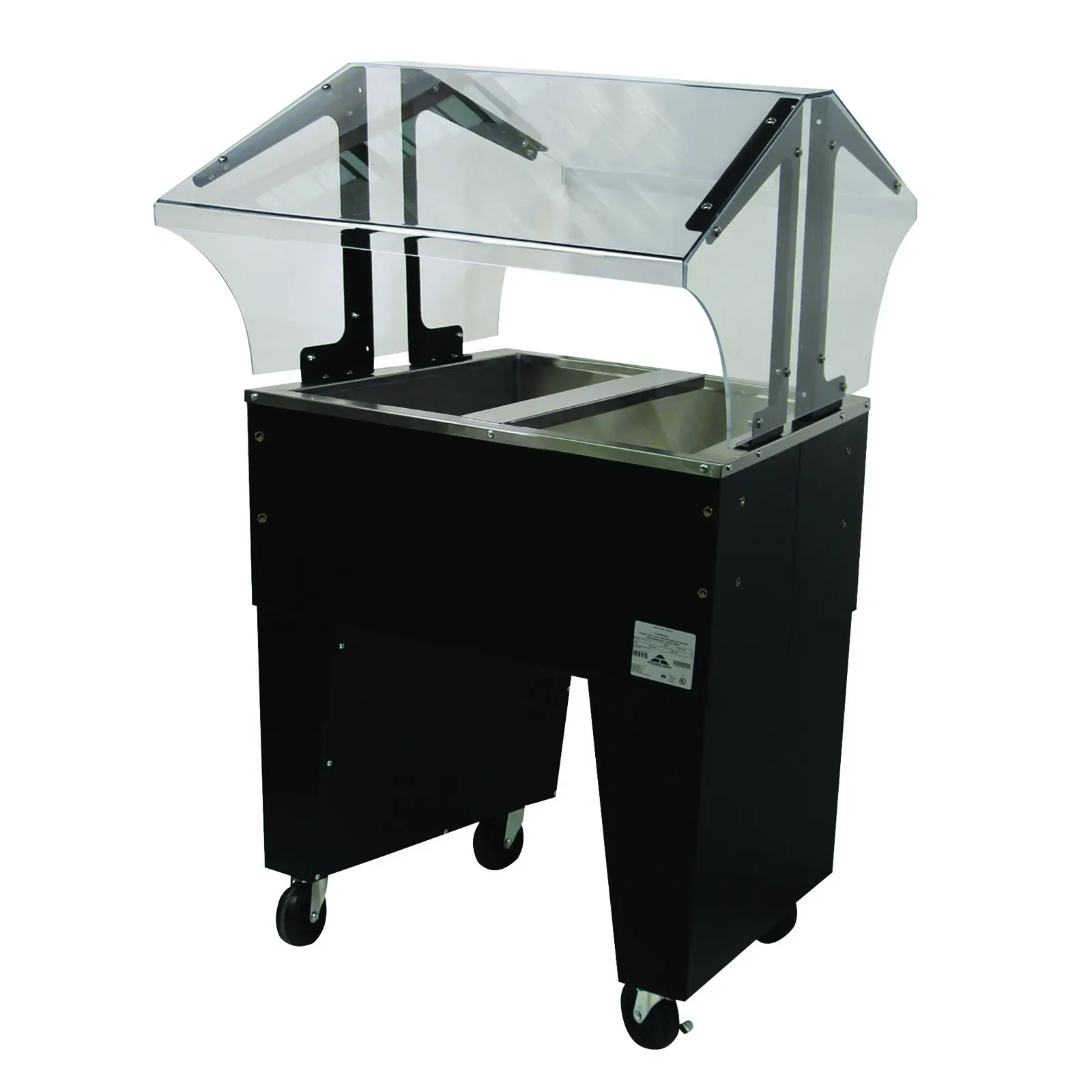 Equip your kitchen for success with the Advance Tabco Ice Cooled Portable Food Buffet Table. This versatile and efficient buffet table, model B2-CPU-B, is designed to meet the high demands of a bustling restaurant environment. With dimensions of 31-13/16"W x 35"D x 53"H, it offers ample space for displaying and serving a variety of dishes. The Ice Cooled Portable Food Buffet Table features a double-sided sneeze guard, ensuring food safety and hygiene from both sides. It accommodates two 12" x 20" pan inserts up to 6-1/4" deep, with additional space below for ice, keeping your food items chilled and fresh. The 8" deep well and 1" IPS drain make it easy to manage and clean, ensuring a seamless operation during busy service hours. Designed with an open base and a sleek black vinyl clad finish, this buffet table not only looks professional but is also highly functional. The four 5" swivel casters, two of which come with brakes, provide easy mobility and stability, allowing you to position the table wherever it' s needed most. NSF certified, the Advance Tabco Ice Cooled Portable Food Buffet Table guarantees compliance with health and safety standards, making it a reliable choice for any restaurant. Enhance your food presentation and service efficiency with this indispensable piece of equipment.