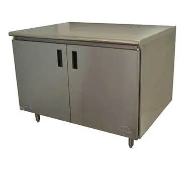 The Advance Tabco Work Table features a cabinet base with a mid-shelf and hinged doors, offering convenient storage for your kitchen tools, ingredients, and equipment. This design helps keep your workspace organized and clutter-free, enhancing efficiency and productivity. The stainless steel legs with adjustable hex feet provide stability on uneven surfaces, ensuring a safe and steady work area for your staff.