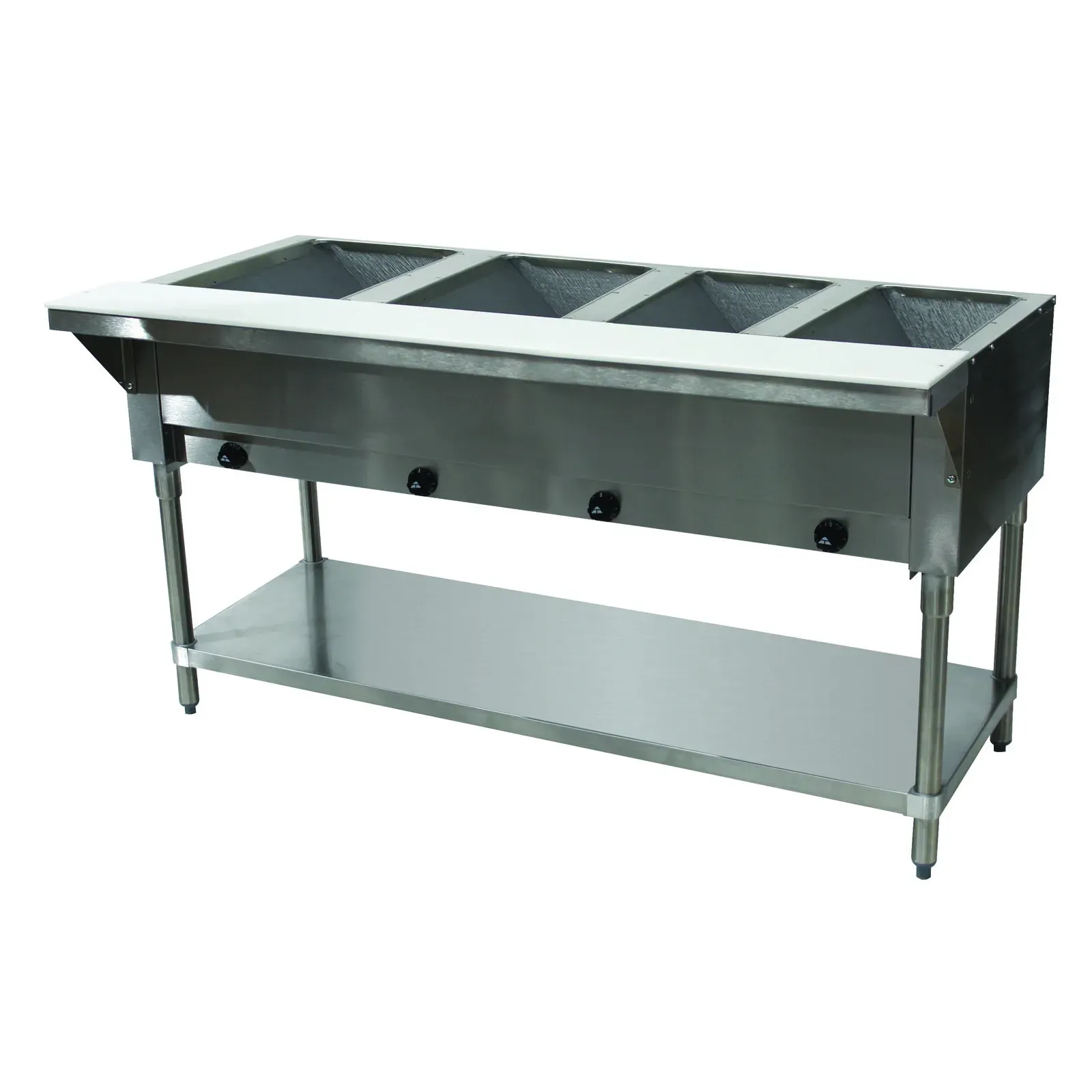 Constructed with a stainless steel top, the Advance Tabco Hot Food Table promises longevity and easy maintenance. The stainless steel 8D support shelf, complete with a removable 3/8" thick poly cutting board, provides additional workspace and convenience, making food preparation more efficient. The galvanized open base with an undershelf offers ample storage space for your kitchen essentials.
