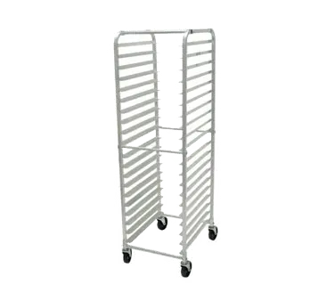 The Mobile Pan Rack boasts a robust bolted extruded aluminum frame, providing durability and stability for daily use in a busy kitchen environment. It features a 1-1/2 ribbed angle, which securely holds up to (10) 18" x 26" pans or (20) 13" x 18" pans, making it ideal for various baking and cooking needs. The front-loading design further enhances convenience, allowing for seamless integration into your kitchen workflow.