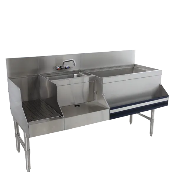 The Prestige Uni-Serv Speed Bar features an 11-inch deep ice bin on the left, providing ample space for ice storage without the need for a cold plate. This thoughtful design helps maintain the ice's integrity, ensuring your drinks are always served chilled.