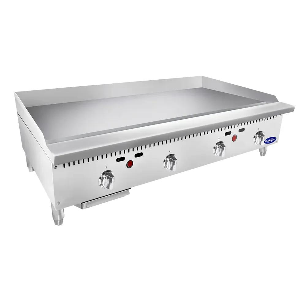 Deliver food perfection with the Atosa USA, ATTG-48 Gas Countertop Griddle. This heavy-duty griddle is designed to meet the demands of a commercial restaurant kitchen. With a spacious 48"W x 28-3/5"D cooking area, you'll have plenty of space to cook multiple dishes at once. The 1" thick griddle plate ensures even heat distribution for consistent cooking results. Equipped with four stainless steel burners and standby pilots, this griddle offers a total of 100,000 BTU's of power. The thermostatic controls allow you to easily adjust the temperature to suit your cooking needs. Made with a stainless steel structure and adjustable stainless steel legs, this griddle is built to withstand the rigors of a busy kitchen. ETL-Sanitation certified, this griddle is not only efficient but also safe to use. Upgrade your restaurant kitchen with the Atosa USA, ATTG-48 Gas Countertop Griddle and experience superior cooking performance.