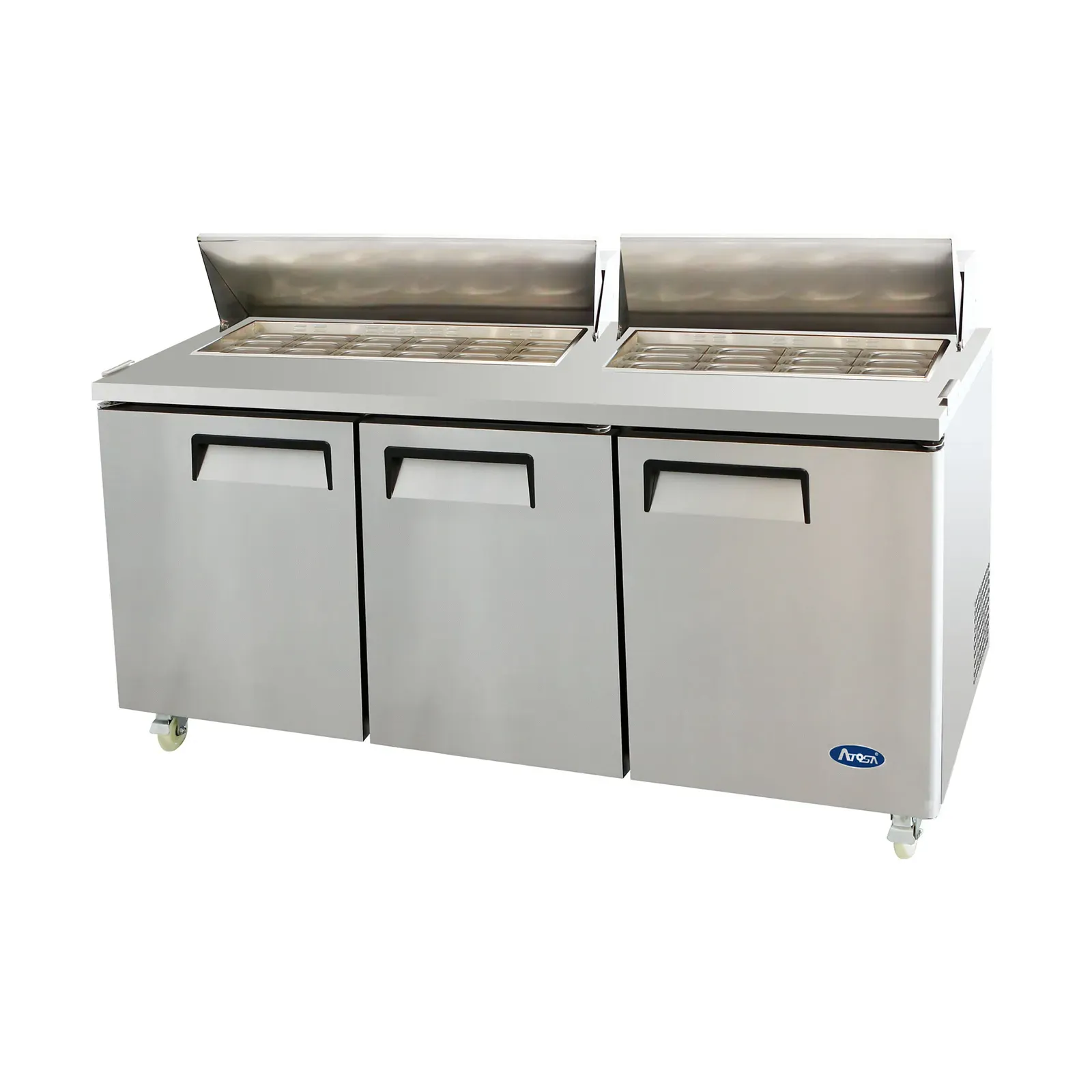 Cook with confidence and flair with the Atosa USA, MSF8308GR Refrigerated Counter, Mega Top Sandwich/Salad Unit. This three-section unit is designed to meet the demands of a busy commercial restaurant kitchen. With its spacious 72-7/10" width, it provides ample storage for all your sandwich and salad ingredients. The unit comes with 30 stainless steel pans, allowing you to organize and display your ingredients in an efficient and visually appealing way. The rear-mounted, self-contained refrigeration system ensures consistent cooling, while the digital temperature control allows you to easily adjust the temperature between 33° to 40°F. The unit also features three adjustable shelves, a 10" poly cutting board, and a stainless steel interior and exterior for durability and easy cleaning. With its automatic evaporation and air defrost system, maintenance is a breeze. The Atosa USA, MSF8308GR is the perfect addition to any commercial restaurant kitchen, providing you with the reliability and functionality you need to create delicious sandwiches and salads with ease.