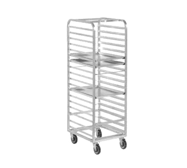 Invest in the future of food service with Channel Manufacturing's 401A Pan Rack, Bun. This mobile rack is designed to streamline your restaurant operations, offering convenience and efficiency. With dimensions of 20-1/2"W x 26"D x 70-1/4"H, it provides ample space for up to 20 18" x 26" bun pans. The open sides and front load design make it easy to load and unload pans, saving you valuable time in a busy kitchen. The welded aluminum construction ensures durability and longevity, while the 3" spacing between racks allows for proper air circulation, keeping your baked goods fresh. Equipped with 5" swivel plate casters with non-marking tread, this rack is easy to maneuver and won't damage your floors. NSF certified and made in the USA, this Channel Manufacturing pan rack is a reliable and essential addition to any commercial restaurant.
