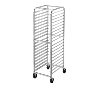 Maximize efficiency in the kitchen with the Channel Manufacturing 401AC Pan Rack. Designed for commercial restaurant use, this bun pan rack is a must-have for any busy kitchen. With its welded aluminum construction, this rack is both durable and lightweight, making it easy to maneuver and transport. The open sides and front load design allow for quick and easy access to your pans, while the 3" spacing ensures optimal airflow for even baking. With a capacity of 20 18" x 26" bun pans, this rack can handle all your baking needs. The 5" swivel casters make it easy to move the rack around the kitchen, while the NSF certification ensures its safety and sanitation. Made in the USA by Channel Manufacturing, this bun pan rack is a reliable and efficient addition to any commercial kitchen.