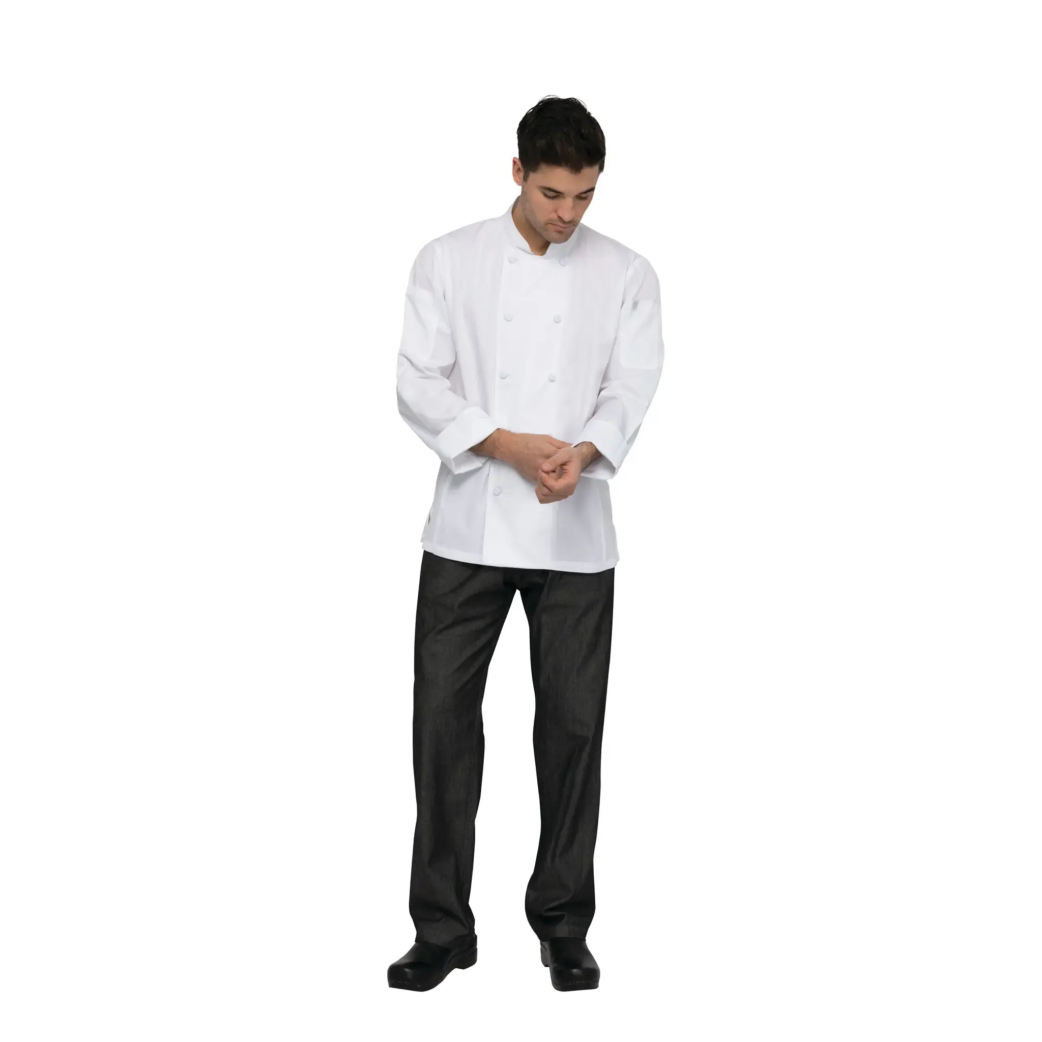 Style that resonates in every dish. The Chef Works CBC01WHTS Chef's Coat is the epitome of culinary elegance. Designed with the discerning chef in mind, this double-breasted jacket features long sleeves that can be rolled up for added convenience. The Cool Vent side panels ensure breathability, keeping you cool and comfortable even in the heat of the kitchen. With a left sleeve thermometer pocket and a right sleeve utility pocket, you'll have easy access to essential tools at all times. The inner pocket provides additional storage space for personal items. Made from a durable 65/35 poly/cotton twill blend, this chef's coat is built to withstand the demands of a busy commercial restaurant. Its modern fit, side seam slits, and back collar apron holder with an engraved snap add a touch of sophistication. Elevate your culinary style with the Chef Works CBC01WHTS Chef's Coat.