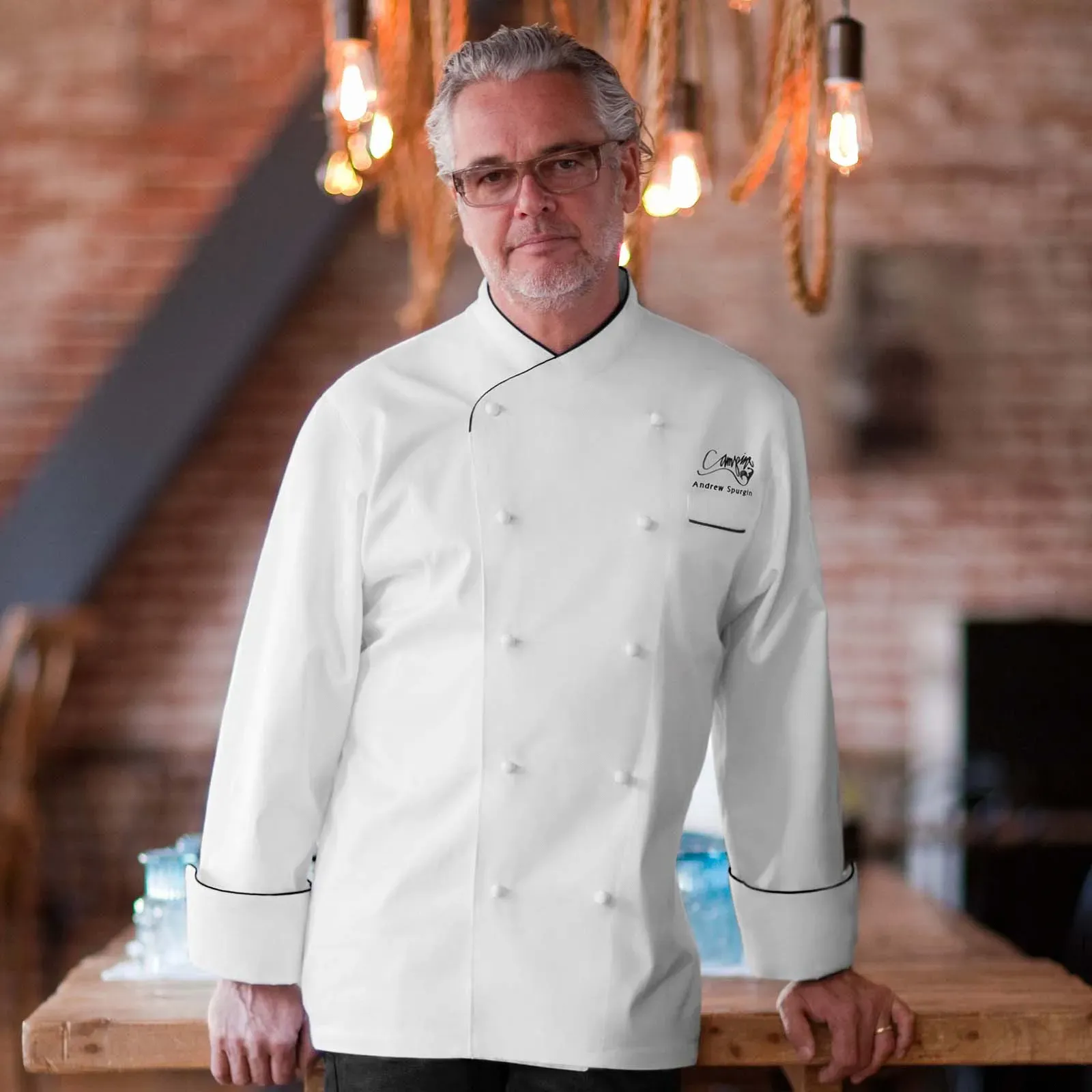 Introducing the Chef Works ECCBWHT42 Chef's Coat, a must-have for culinary triumphs in commercial restaurants. Crafted by Chef Works, this coat is designed to celebrate the position of an executive chef with its classic features and authentic details. Made from 100% Super Combed 120 Cotton, it offers superior comfort and durability. The double-breasted design, long sleeves, and French cuffs exude professionalism, while the underarm vents ensure breathability during long hours in the kitchen. The cross-over collar detail sets this coat apart, adding a touch of elegance. With hand-rolled buttons, left chest inset, and thermometer pockets, it offers convenience and functionality. The generous fit allows for ease of movement, making it ideal for busy chefs. Whether you're leading a team or creating culinary masterpieces, the Chef Works ECCBWHT42 Chef's Coat is the perfect choice for a polished and professional look.