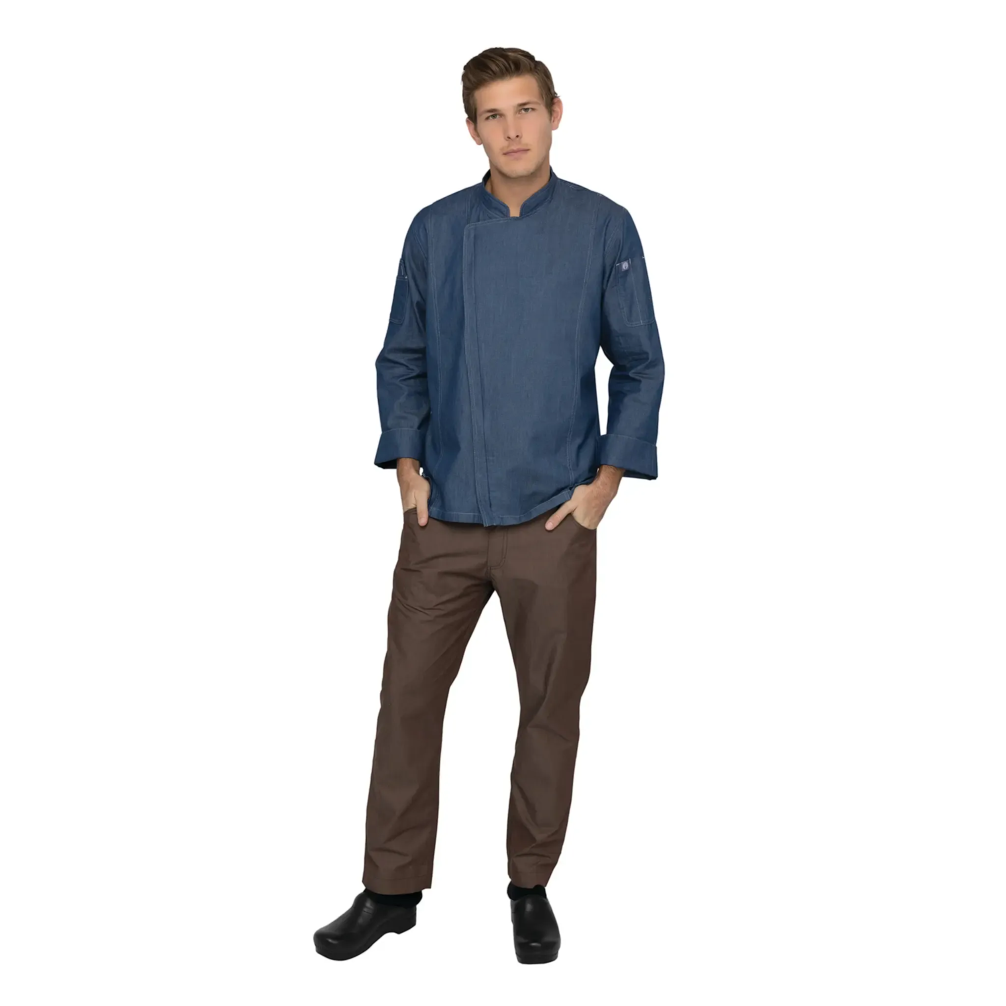 Boost kitchen confidence and elevate taste with the Chef Works EXDZ001IBLXS Chef's Coat. This Gramercy Executive Chef Coat is designed to transform chefs with its elevated details and authentic style. Made from 100 percent cotton denim, this single-breasted coat features roll-up long sleeves with tabs, allowing for easy customization and comfort in a fast-paced kitchen environment. The 2-way separating zipper ensures a secure fit, while the contrast double-stitching throughout adds durability and style. The back collar apron holder with an engraved snap keeps your apron securely in place, while the left sleeve rounded thermometer pocket and right sleeve rounded cell phone/notebook pocket with a hidden earphone hole provide convenient storage options. With its modern fit and indigo blue color, this chef's coat from Chef Works is perfect for commercial restaurant use. Boost your confidence and elevate your culinary creations with the Gramercy Executive Chef Coat.