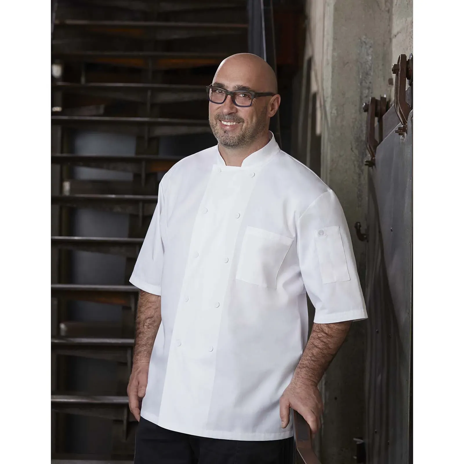Elevate kitchen vibes with chef finesse. The Chef Works, JLCVWHT5XL, Chef's Coat is the perfect addition to any commercial restaurant kitchen. Made with 4.7 oz., 65/35 poly/cotton lite twill fabric, this coat offers both comfort and durability. The Cool Vent back yoke ensures breathability, keeping you cool and comfortable even when things heat up in the kitchen. The double-breasted design and cloth-covered buttons add a touch of sophistication, while the short sleeves provide freedom of movement. With a left chest patch and thermometer pockets, you'll have easy access to your essentials. The classic fit and white color give a clean and professional look, making this coat a must-have for chefs who value style and functionality.