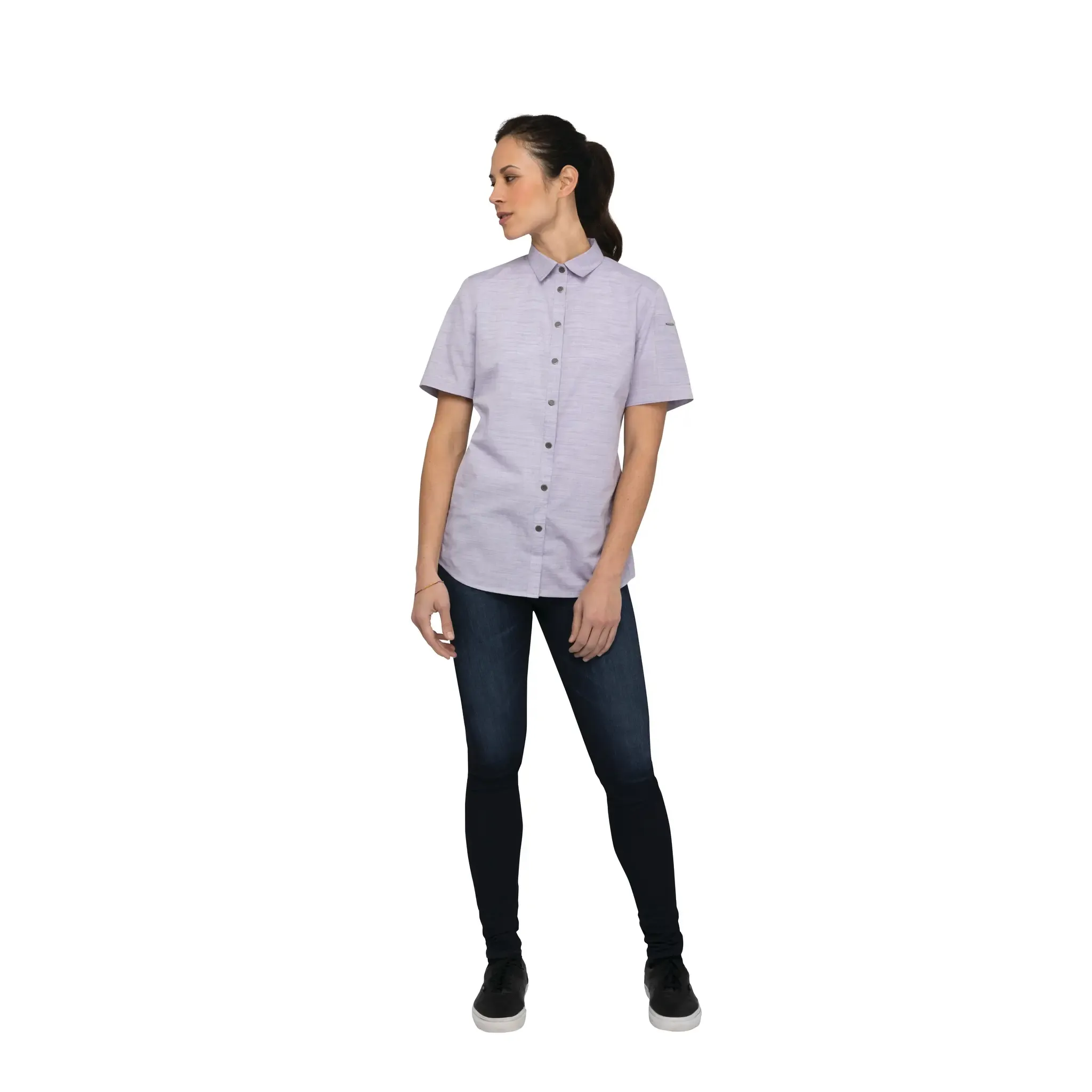 Crafted for chefs, adored by kitchens. Introducing the Chef Works SHC01WPURS Cook's Shirt, a tailored and feminine garment designed for the modern culinary professional. This shirt offers a slightly relaxed silhouette, providing a rare balance of comfort and efficiency. The short sleeves ensure maximum mobility, while the snap-front closure allows for quick and convenient changes. The front darts give the shirt a perfect fit, enhancing both style and functionality. Made from a durable 65/35 poly/cotton blend, this shirt is built to withstand the demands of a busy commercial restaurant. It features a left sleeve pocket for easy storage of essential tools, and a back collar apron holder with a snap button for added convenience. The back yoke with pleats adds a touch of sophistication to the modern fit. Available in a vibrant purple color, this Women's Havana Shirt is a must-have for any female chef looking to make a statement in the kitchen.