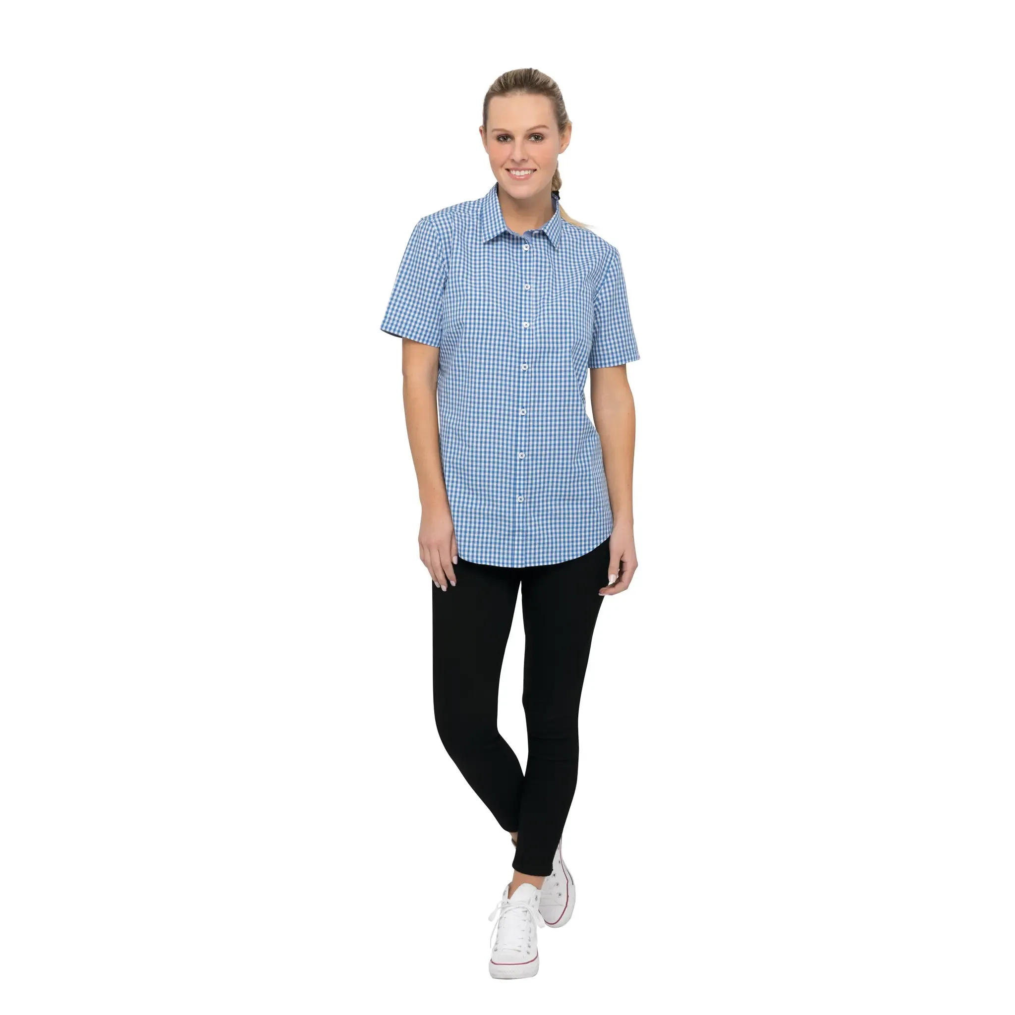 Elevate chef style effortlessly with the Chef Works SHC02WBLUM Cook's Shirt. Designed with women in mind, this shirt offers a tailored, feminine fit that's slightly relaxed through the silhouette. The short sleeves provide comfort and freedom of movement, perfect for a fast-paced commercial restaurant environment. The contrast fabric on the inner-sleeve band adds a touch of style, while the button front allows for easy on and off. The top right placket and inner collar band feature a contrasting fabric, adding a pop of color to the classic blue design. Made from a 65/35 yarn-dyed poly/cotton blend, this shirt is durable and easy to care for. The back yoke with inverted pleat provides additional comfort and flexibility. Elevate your restaurant's image with the Chef Works SHC02WBLUM Cook's Shirt.