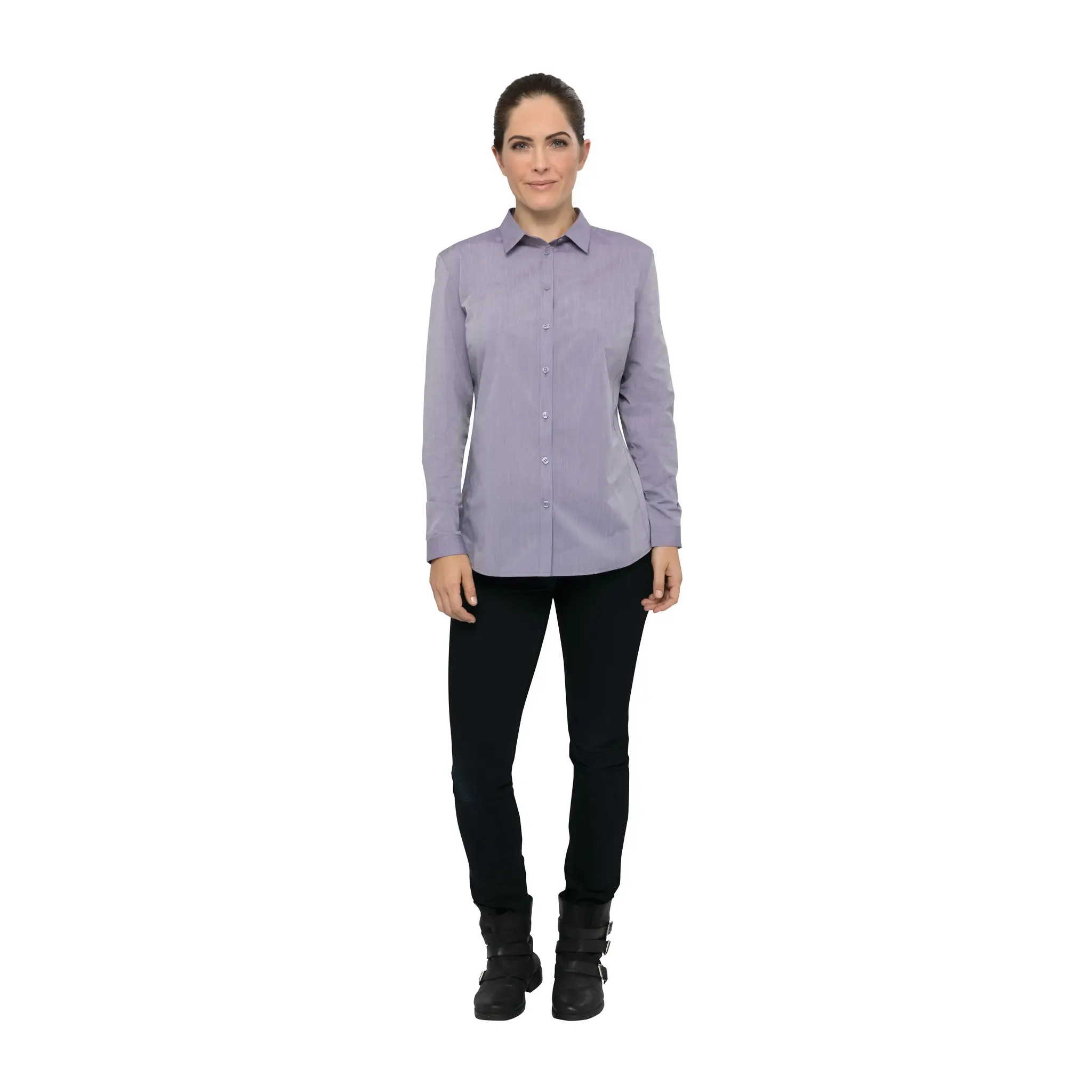 Elevate your culinary presentation with the Chef Works SHC06WPURM Cook's Shirt. This women's modern chambray dress shirt is designed with a slightly relaxed silhouette and a tailored fit, ensuring both style and comfort in a commercial restaurant setting. The roll-up long sleeves with a button tab allow for versatility and convenience, while the 2-button cuff adds a touch of sophistication. The side hem detail and back yoke enhance the overall look of the shirt, making it a fashionable choice for any chef. Made from a poly/cotton yarn-dyed blend, this shirt is not only durable but also features an anti-wrinkle finish, ensuring it stays crisp and professional throughout the day. With a tonal button front closure and a modern fit, this purple cook's shirt is a must-have for any culinary professional.
