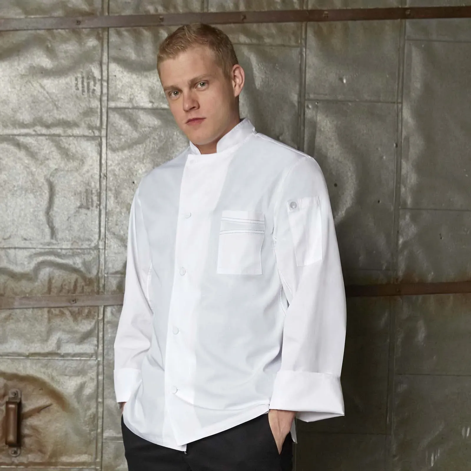 Where functionality meets chef style, the Chef Works VSSSBBK3XL Chef's Coat is the epitome of cool and comfort. Designed for commercial restaurant use, this single-breasted coat features long sleeves and Cool Vent side/back panels, ensuring breathability and temperature control during long hours in the kitchen. The contrasting topstitching adds a touch of sophistication, while the side seam slits allow for ease of movement. The top snap and cloth-covered buttons provide a secure closure, while the left chest and thermometer pockets offer convenient storage for essential tools. Made from a durable 65/35 poly/cotton twill fabric, this coat is built to withstand the demands of a busy kitchen. With its classic fit and attention to detail, the Valais Chef Coat from Chef Works is the perfect choice for chefs who value both style and functionality.