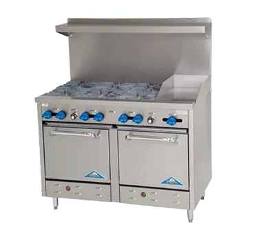 Equip your kitchen for superior culinary excellence with the Comstock-Castle F3218-12 Range. This 48" gas range is designed specifically for commercial restaurant use, offering exceptional performance and durability. With six 24000 BTU star burners and 12" square cast iron grates, this range provides precise heat distribution and maximum cooking space. The 12" - 3/4" thick griddle with manual controls adds versatility to your menu options. The two space-saver ovens feature enamel door and bottom linings, along with a rack per oven with three positions, allowing you to cook multiple dishes simultaneously. The stainless steel exterior and high shelf not only enhance the range's aesthetic appeal but also ensure easy cleaning and maintenance. With 6" stainless steel legs and a cook surface height of 37", this range offers convenience and ergonomic design. With a powerful 214000 BTU output, this NSF and cETLus certified range is a reliable and efficient addition to any commercial kitchen.