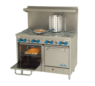 Crafting success in every culinary journey, Comstock-Castle presents the F3218 Range, a 48" gas range designed specifically for commercial restaurant use. With its eight 24000 BTU star burners and 12" square cast iron grates, this range offers exceptional heat distribution and cooking versatility. The two space-saver ovens, featuring enamel door and bottom linings, provide ample space for baking and roasting, with one rack per oven and three adjustable positions. The stainless steel exterior ensures durability and easy cleaning, while the high shelf offers convenient storage for utensils and ingredients. Standing at 37" tall to the cook surface, this range provides comfortable access for chefs and cooks. With a powerful 242000 BTU output, this NSF and cETLus certified range delivers exceptional performance and reliability, making it the perfect choice for any commercial restaurant seeking efficiency and excellence in their culinary endeavors.