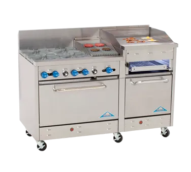 Introducing the Comstock-Castle F3226-24B Range, a premium tool for crafting culinary masterpieces in commercial restaurants. This gas range is designed to meet the demands of a busy kitchen, with a generous 60" width and six 24000 BTU star burners featuring 12" square cast iron grates. The range also includes a 24" raised griddle-cheesemelter with a 3/4" thick plate and manual control, perfect for melting cheese or grilling sandwiches. The stainless steel mesh flame spreader and 18" x 18" rack below the griddle ensure even heat distribution and convenient storage. Two standard ovens, each measuring 26-1/2" W x 21-1/2" D, provide ample cooking space, while the stainless steel exterior and high back riser exude durability and style. With 6" stainless steel legs and 37" & 40" tall cook surfaces, this range offers versatility and ease of use. With a total of 234000 BTU and NSF and cETLus certifications, the Comstock-Castle F3226-24B Range is a reliable and efficient choice for any commercial kitchen.