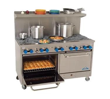 Elevate your kitchen experience with precision tools. Introducing the Comstock-Castle F3226-36 Range, a must-have for any commercial restaurant. This 60" wide gas range is designed to meet the demands of a busy kitchen, ensuring efficient and reliable performance. Equipped with four 24000 BTU star burners and 12" square cast iron grates, this range provides exceptional heat distribution and durability. The 36" - 3/4" thick griddle with manual controls offers versatility for cooking a variety of dishes. With two standard ovens featuring enamel door and bottom linings, you can easily bake multiple items simultaneously. Each oven includes a rack with three positions, allowing for flexible cooking options. The stainless steel exterior, back riser, and high shelf not only enhance the range's durability but also add a sleek and professional look to your kitchen. With 6" stainless steel legs, this range stands at 37" tall to the cook surface, providing ergonomic convenience. Boasting a powerful 216000 BTU, this NSF and cETLus certified range is a reliable and efficient addition to any commercial kitchen.