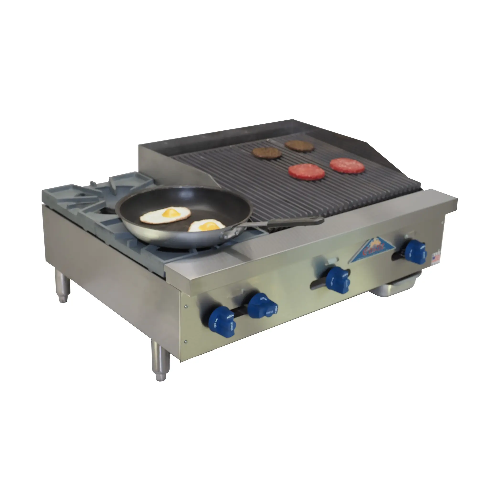 Introducing the Comstock-Castle FHP36-2RB Charbroiler / Hotplate, Gas, Countertop a high-quality cooking gear that guarantees exceptional performance in any commercial restaurant. This versatile unit combines a 24" x 21" char-broiler area with cast iron grates and iron radiants, ensuring even heat distribution and perfect grill marks on your meats and vegetables. The two 24,000 BTU star burners provide powerful heat for your hotplate needs, allowing you to cook multiple dishes simultaneously. With stainless steel splash guards on three sides and a stainless steel exterior finish, this unit is not only durable but also easy to clean. The four manual controls give you precise control over the 98,000 BTU output, ensuring consistent results every time. Whether you're grilling, searing, or saut ing, the Comstock-Castle FHP36-2RB is the ideal choice for any commercial kitchen.