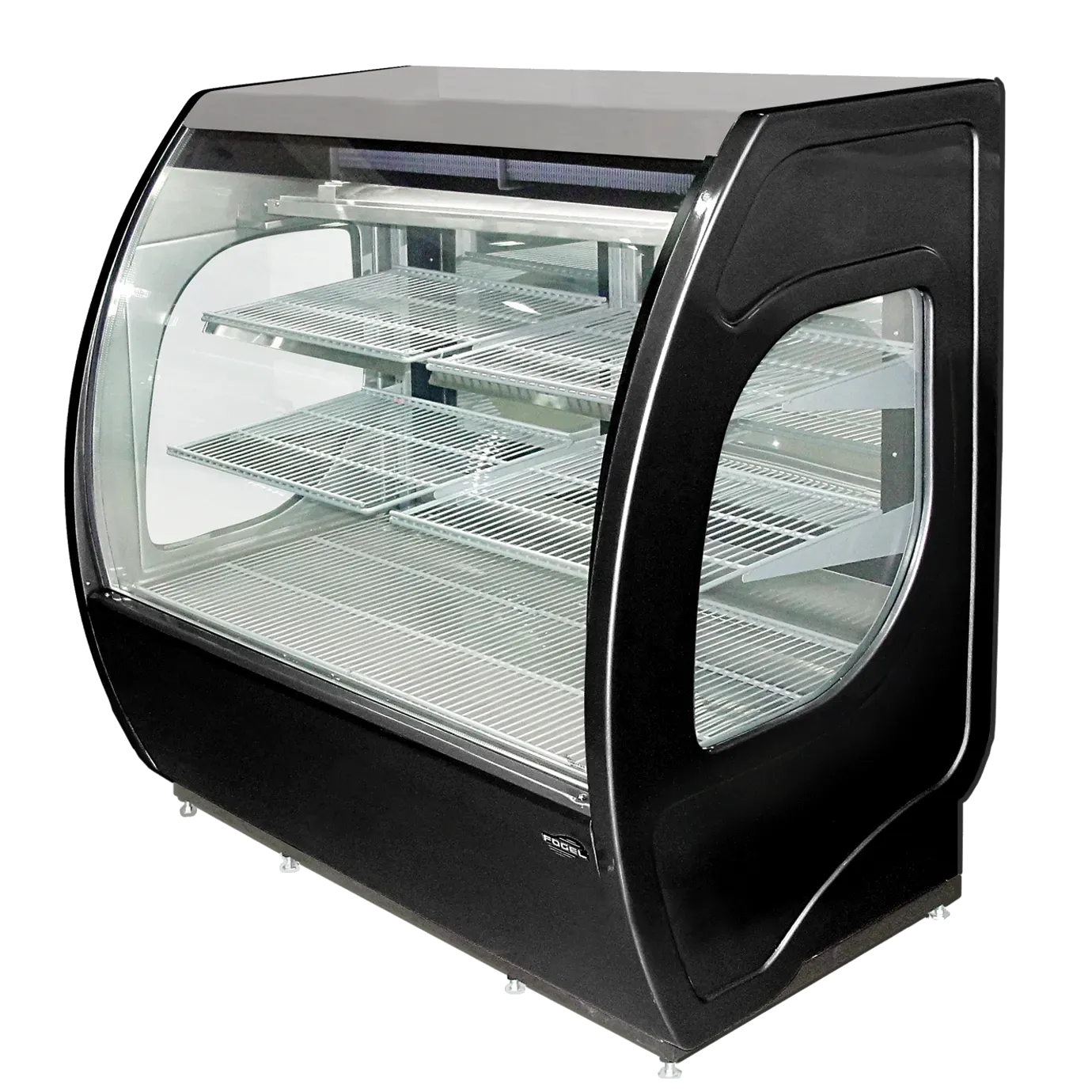 Introducing the Fogel ELITE-4-DC-HC-B Display Case, Refrigerated Deli, designed to inspire freshness in your commercial restaurant. With its curved front glass and sleek black coated steel exterior, this display case adds a touch of elegance to any establishment. Boasting a spacious 19.0 cu. ft. capacity, it provides ample room to showcase your delectable bakery creations. The two rear sliding glass doors allow for easy access and convenient restocking, while the four shelves and three levels of display glass sides offer versatile presentation options. The LED lighting illuminates your products, enhancing their visual appeal. Equipped with electronic controls and gravity coil self-contained refrigeration, this display case ensures optimal temperature and humidity levels for your baked goods. With a 1/4 HP motor and 115v/60/1-ph power supply, it delivers reliable performance. Elevate your bakery offerings with the Fogel ELITE-4-DC-HC-B Display Case, Refrigerated Deli.