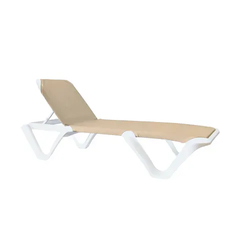 Enhance ambiance with stylish outdoor elements. Introducing the Grosfillex US894004 Chaise, Outdoor. This khaki sling on a white frame adds a touch of elegance to any commercial restaurant setting. With its 3-position adjustable back, your guests can find the perfect level of comfort while enjoying their meals. The woven vinyl coated polyester fabric is not only color-fast but also easy to clean, making it ideal for high-traffic areas. The stackable design allows for easy storage, saving valuable space when not in use. The white resin frame is not only durable but also resistant to UV rays and harsh weather conditions, ensuring long-lasting performance. Providing ample seating for your guests, this chaise lounge is a practical addition to your outdoor space. Trust Grosfillex, a renowned vendor in the industry, to deliver quality and style to your outdoor dining area.