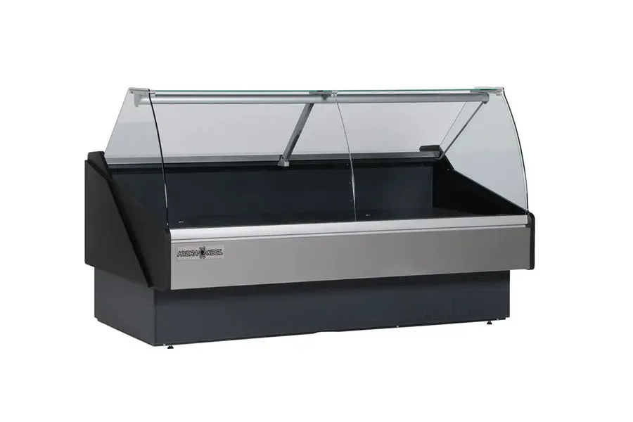 Display excellence with sophistication using the Hydra-Kool, KFM-CG-120-R Fresh Meat Case Curved Glass. This multiplexible service type case is designed to elevate your commercial restaurant's meat and deli display. With its tilt-forward curved front tempered glass and anti-condensate system, your customers will have a clear view of the mouthwatering offerings. The tempered glass sides and rear removable tempered sliding glass doors ensure easy access for staff while maintaining optimal temperature and freshness. The LED interior lighting illuminates the stainless steel interior, showcasing your products in the best light. The digital controller allows for precise temperature control, while the adjustable feet ensure stability on any surface. With a top sill depth of 10-1/2" and a rear work shelf depth of 8-5/8", you'll have ample space for preparation and presentation. The PVC coated silver steel front panel and gray kick plate add a touch of elegance to this high-performance case. Designed for remote refrigeration, this ETL-Sanitation and cETLus certified case is a must-have for any commercial restaurant looking to impress customers and maximize sales.