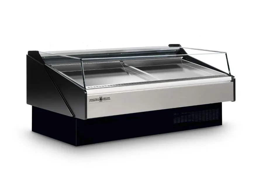 Introducing the Hydra-Kool, KFM-SO-100-S Seafood Case Open Front, the perfect solution for commercial restaurants looking to showcase the freshest selections. With its open front design and tempered front and side glass, this display case allows customers to easily view and choose their desired seafood. The stainless steel rear work bench provides a convenient space for preparation, while the digital controller ensures precise temperature and defrost regulation, maintaining a temperature range of 33 F - 40 F. The included ice pans keep the seafood fresh and appetizing. The silver PVC coated steel front panel and black steel kick plate add a sleek and professional touch to any restaurant setting. With self-contained refrigeration and two 1/2 HP compressors, this seafood case is both efficient and reliable. Trust Hydra-Kool to deliver exceptional quality and performance for all your commercial restaurant needs.