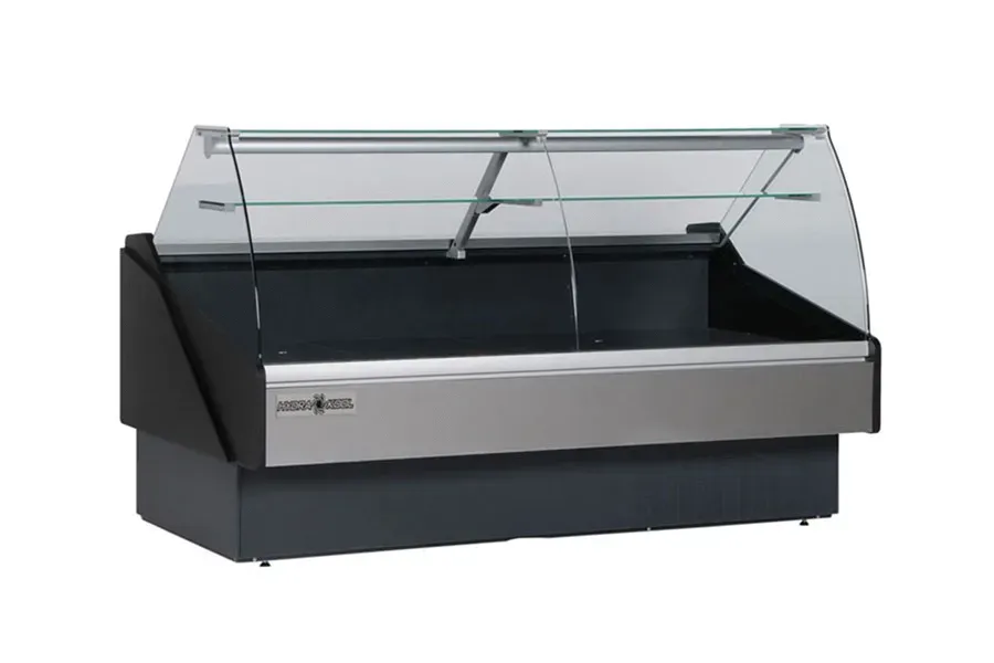 Introducing the Hydra-Kool, KPM-CG-60-S, Packaged Meat Curved Glass display case a masterpiece of quality and functionality designed for commercial restaurant use. This multiplexible display case is perfect for showcasing package products with its tilt-forward curved front tempered glass and anti-condensate system. The tempered glass sides and LED interior lighting provide optimal visibility, while the digital controller ensures precise temperature control. The rear removable tempered sliding glass doors and rear storage compartment offer easy access and convenient storage. With a PVC coated gray steel interior, tempered non-refrigerated glass shelf, and adjustable feet, this display case is built to withstand the demands of a busy restaurant environment. The PVC coated silver steel front panel with a gray lower panel adds a touch of elegance. ETL-Sanitation and cETLus certified, this Hydra-Kool display case is a reliable and efficient choice for any commercial restaurant. Highlight quality with an artistic showcase using the Hydra-Kool, KPM-CG-60-S, Packaged Meat Curved Glass display case.