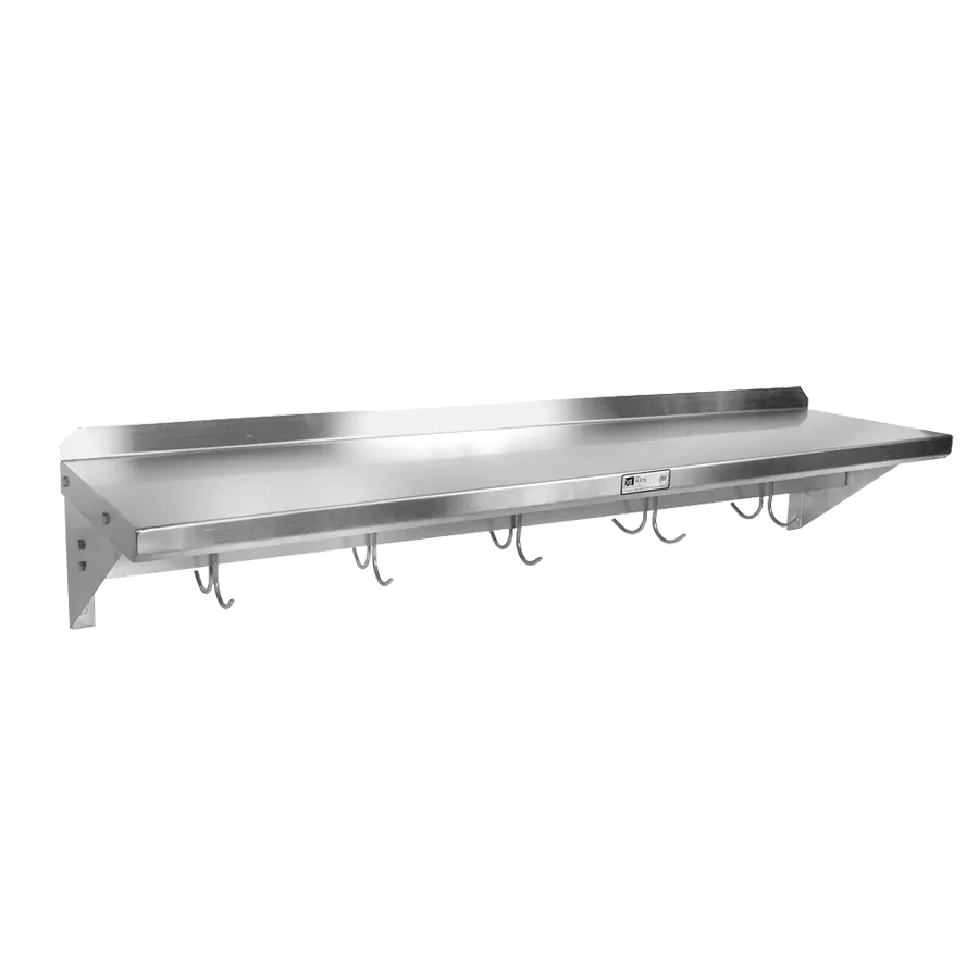 Modernize operations with smart choices using the John Boos BHS1296PR Overshelf, Wall-Mounted With Pot Rack. This versatile and practical addition to any commercial restaurant provides ample storage space and a convenient pot rack for easy access to cookware. With its 96-inch width, 12-inch depth, and 9-12 inch height, this shelf is designed to maximize efficiency in busy kitchens. The Stallion Safety Edge front ensures durability and safety, while the 8 stainless steel hooks offer a convenient solution for hanging pots and pans. Made from high-quality 18300 stainless steel, this shelf is built to withstand the demands of a commercial kitchen. NSF certified, it meets the highest standards of cleanliness and sanitation. Whether you need extra storage or a space-saving solution, the John Boos BHS1296PR Overshelf, Wall-Mounted With Pot Rack is the perfect choice for any restaurant looking to optimize their workspace.