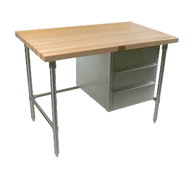 Revolutionize operations with adaptable choices using the John Boos BTNS03 Work Table with Wood Top. This versatile work table is designed to meet the demands of a commercial restaurant setting. With its 72-inch width, 30-inch depth, and 35-1/4-inch height, it provides ample space for food preparation and other tasks. The 1-3/4-inch thick edge grain top is made of antimicrobial Northern Hard Rock Maple, ensuring a hygienic surface for food handling. The penetrating oil finish enhances the wood's natural beauty while providing protection against moisture and stains. The open cabinet base features three drawers, offering convenient storage for utensils, tools, and other essentials. Stainless steel bracings, legs, and bullet feet provide stability and durability. NSF certified and easy to assemble, this work table is a reliable addition to any commercial kitchen. Upgrade your restaurant's efficiency and functionality with the John Boos BTNS03 Work Table with Wood Top.