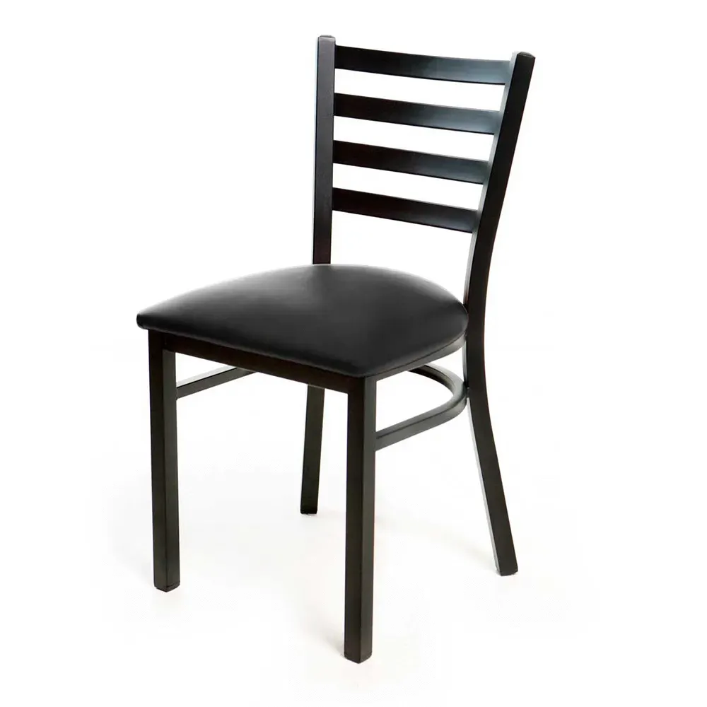 Fuel your restaurant's success with the JustChair Manufacturing M20118-BLK-PS BVS Side Chair. This chair is designed to enhance the dining experience for your customers while providing durability and comfort. The ladder back design adds a touch of elegance to any restaurant setting, while the upholstered padded seat ensures that your guests can dine in comfort for extended periods. The welded 18 gauge steel frame with a textured black powder coat finish not only adds strength and stability but also gives the chair a sleek and modern look. The black nylon glides protect your floors from scratches and scuffs, making it perfect for high-traffic areas. The black vinyl upholstery is not only easy to clean but also adds a touch of sophistication to your restaurant's decor. With quick ship availability, you can have these chairs in your restaurant in no time. Fuel your restaurant's success with the JustChair Manufacturing M20118-BLK-PS BVS Side Chair.
