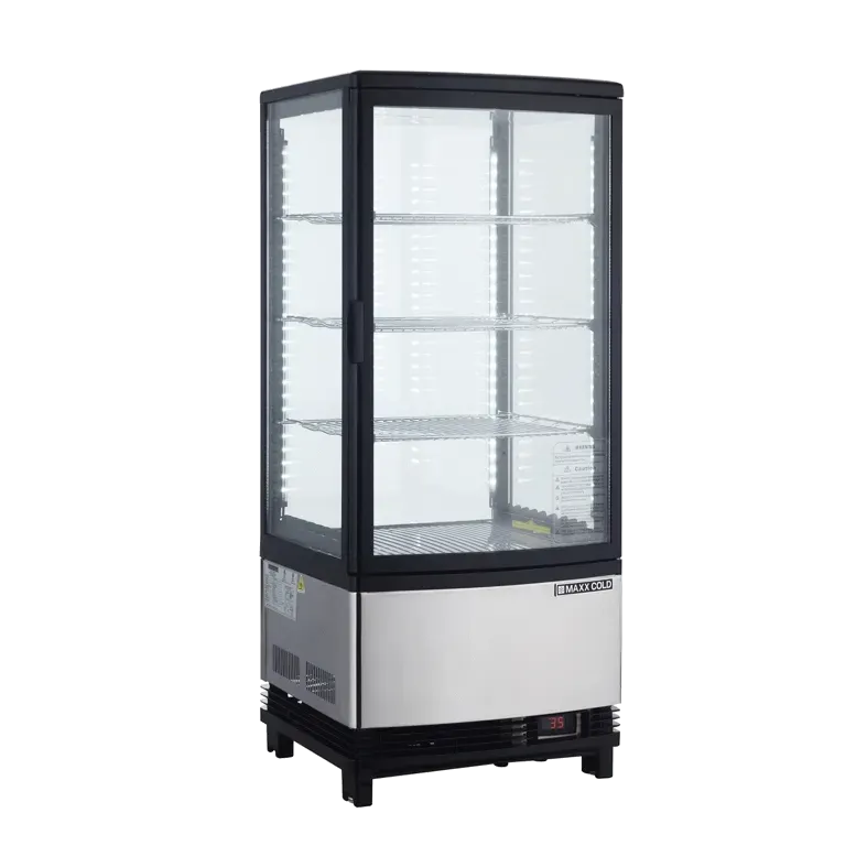 Maximize convenience using the efficient tool with the Maxx Cold MECR-31D Display Case. Designed specifically for commercial restaurant use, this countertop refrigerated merchandiser offers a compact solution for showcasing your delectable offerings. With its double pane 4-sided clear glass, customers can easily view the tempting treats inside. The 3.0 cu.ft. storage capacity provides ample space to display a variety of items, while the three adjustable chrome-plate wire shelves allow for flexible arrangement. The LED lighted interior illuminates your products, enhancing their visual appeal. The black painted steel exterior and ABS interior ensure durability and easy cleaning. The digital control allows for precise temperature management, while the bottom mounted compressor ensures efficient operation. With its cETLus and ETL-Sanitation certifications, you can trust in the quality and safety of this refrigerated display case. Elevate your restaurant's presentation and entice customers with the Maxx Cold MECR-31D Display Case.