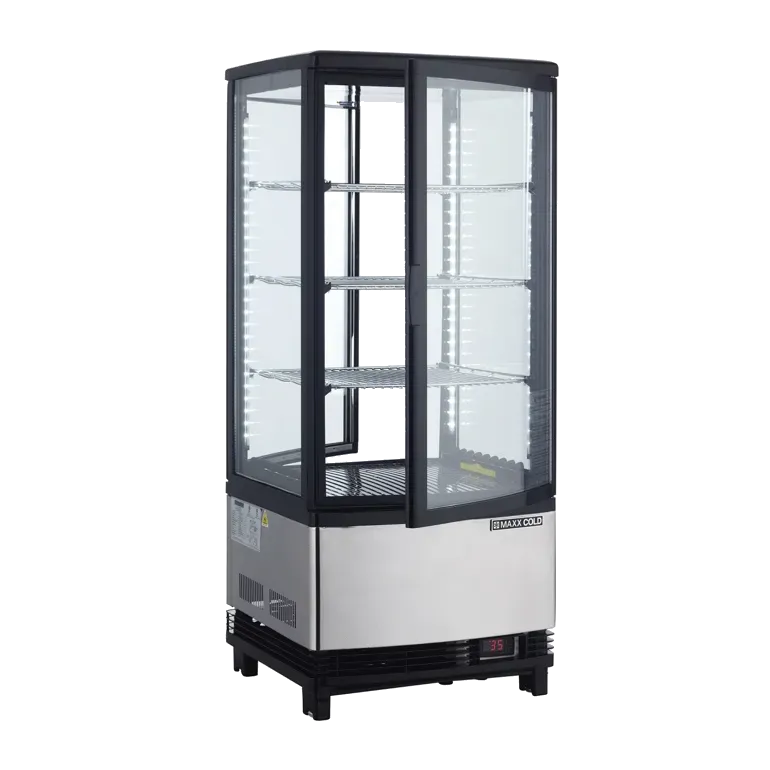 Maximize convenience using the efficient tool with the Maxx Cold MECR-32D Display Case. Designed specifically for commercial restaurant use, this countertop refrigerated merchandiser is a game-changer. With its pass-thru, double pane 4-sided clear glass doors, you can easily showcase your delectable offerings while keeping them at the perfect temperature. The 3.0 cu.ft. storage capacity and three adjustable chrome-plate wire shelves provide ample space for your products. The LED lighted interior ensures optimal visibility, while the black painted steel exterior adds a touch of sophistication to your establishment. The digital control allows for precise temperature management, and the bottom-mounted compressor ensures efficient operation. With R290 refrigerant and cETLus and ETL-Sanitation certifications, this display case is both eco-friendly and safe. Don't compromise on quality or style choose the Maxx Cold MECR-32D Display Case for your restaurant and elevate your food presentation to new heights.