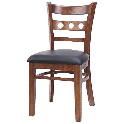 Create Atmosphere That Stands Out with MKLD Furniture, A6025 BV, Chair, Side, Indoor. This elegant side chair is designed to elevate the ambiance of any commercial restaurant. With its ladder back featuring diamond cutouts, it adds a touch of sophistication to your dining space. The European beechwood frame ensures durability and longevity, making it perfect for high-traffic areas. The upholstered seat provides comfort for your guests, allowing them to relax and enjoy their meals. The black vinyl upholstery adds a sleek and modern touch, while the plastic floor glides protect your floors from scratches and scuffs. Trust MKLD Furniture to deliver quality and style that will impress your customers and keep them coming back for more.