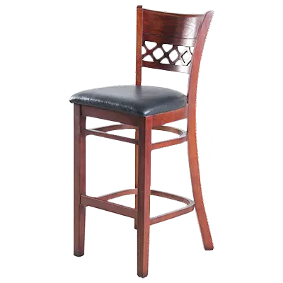 Introducing the MKLD Furniture A6230-BS BV Bar Stool, Indoor. Elevate dining with quality furniture that combines style and functionality. This bar stool is designed to enhance the ambiance of any commercial restaurant setting. With its European beechwood frame and wood back with a criss-cross bottom, it exudes elegance and durability. The upholstered seat provides comfort for patrons, while the footrest ensures a relaxed dining experience. The black vinyl upholstery adds a touch of sophistication and is easy to clean, making it perfect for busy restaurant environments. The bar stool also features plastic floor glides, protecting your floors from scratches and scuffs. Upgrade your restaurant's seating with the MKLD Furniture A6230-BS BV Bar Stool, Indoor, and create a welcoming and stylish dining experience for your customers.