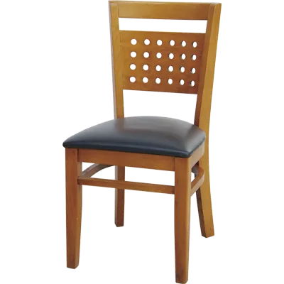 Master the art of dining furniture with MKLD Furniture's A6259 BV Chair. This side chair is designed for indoor use in commercial restaurants, making it the perfect addition to elevate your dining experience. Crafted with a European beechwood frame, this chair exudes elegance and durability. The wood back features circle cutouts, adding a touch of sophistication to any restaurant decor. The upholstered seat ensures comfort for your guests, while the black vinyl upholstery adds a sleek and modern touch. With plastic floor glides, this chair is easy to move and protects your floors from scratches. Trust MKLD Furniture to provide you with high-quality, stylish, and functional dining furniture that will impress your customers and enhance your restaurant's ambiance.