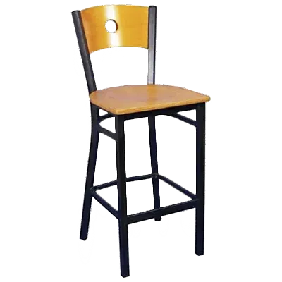 Enhance Restaurant Comfort and Style with the MKLD Furniture, AM836A-BS BV Bar Stool. This stylish and durable bar stool is designed to elevate the ambiance of any commercial restaurant setting. The wood back with a circle cutout adds a touch of sophistication, while the upholstered seat ensures maximum comfort for your patrons. The fully welded 16 gauge steel frame provides exceptional stability and durability, making it perfect for high-traffic areas. The footrest offers additional support, allowing your guests to relax and enjoy their dining experience. With a black powder coat finish and black vinyl upholstery, this bar stool exudes elegance and is easy to clean and maintain. The plastic floor glides protect your floors from scratches and scuffs. Trust MKLD Furniture to deliver quality and style to your restaurant.