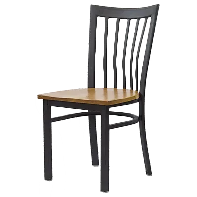 Introducing the MKLD Furniture AM839 V Chair, Side, Indoor. Deliver comfort and class with our decor. This side chair is designed to elevate the ambiance of any commercial restaurant setting. With its slat back and veneer seat, it offers both style and comfort for your guests. The fully welded 16 gauge steel frame ensures durability and stability, while the black powder coat finish adds a touch of sophistication. The plastic floor glides protect your floors from scratches and scuffs. Whether you're running a fine dining establishment or a casual eatery, this chair is the perfect addition to create a welcoming and elegant atmosphere. Trust MKLD Furniture to provide you with quality furniture that enhances your restaurant's aesthetic and ensures your guests' comfort.