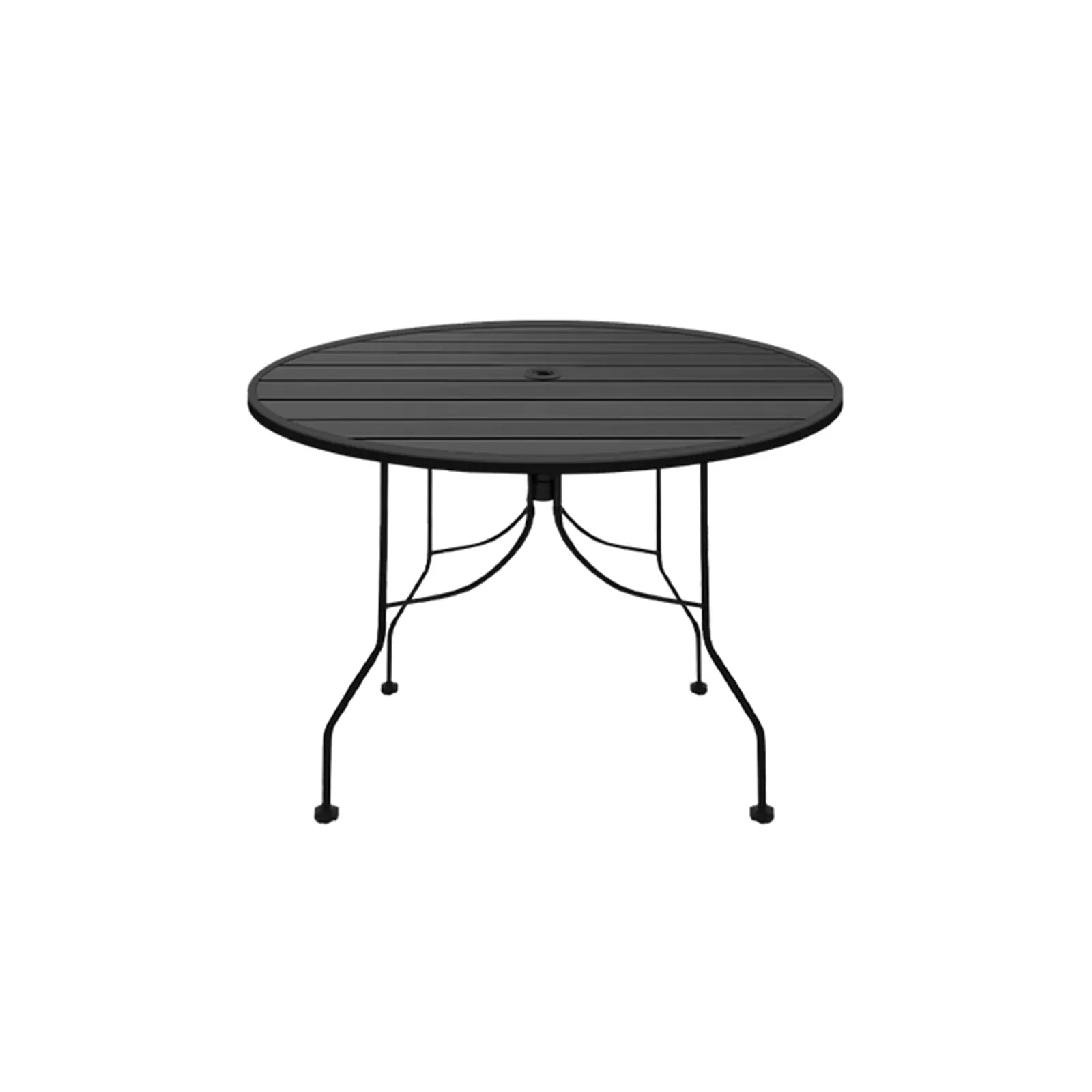 Furnish your eatery for success with the Oak Street OB36R-STD Outdoor Table. This round table is designed for both indoor and outdoor use, making it a versatile addition to any commercial restaurant. The 36" diameter provides ample space for guests to dine comfortably, while the standard height ensures a convenient dining experience. The rolled steel top adds durability and a sleek look, while the black finish complements any restaurant decor. With a 2" umbrella hole, this table allows you to provide shade for your customers on sunny days. The steel base provides stability and ensures the table remains sturdy even in high-traffic areas. Easy to assemble, this table is shipped unassembled for your convenience. Enhance your restaurant's ambiance and functionality with the Oak Street OB36R-STD Outdoor Table.