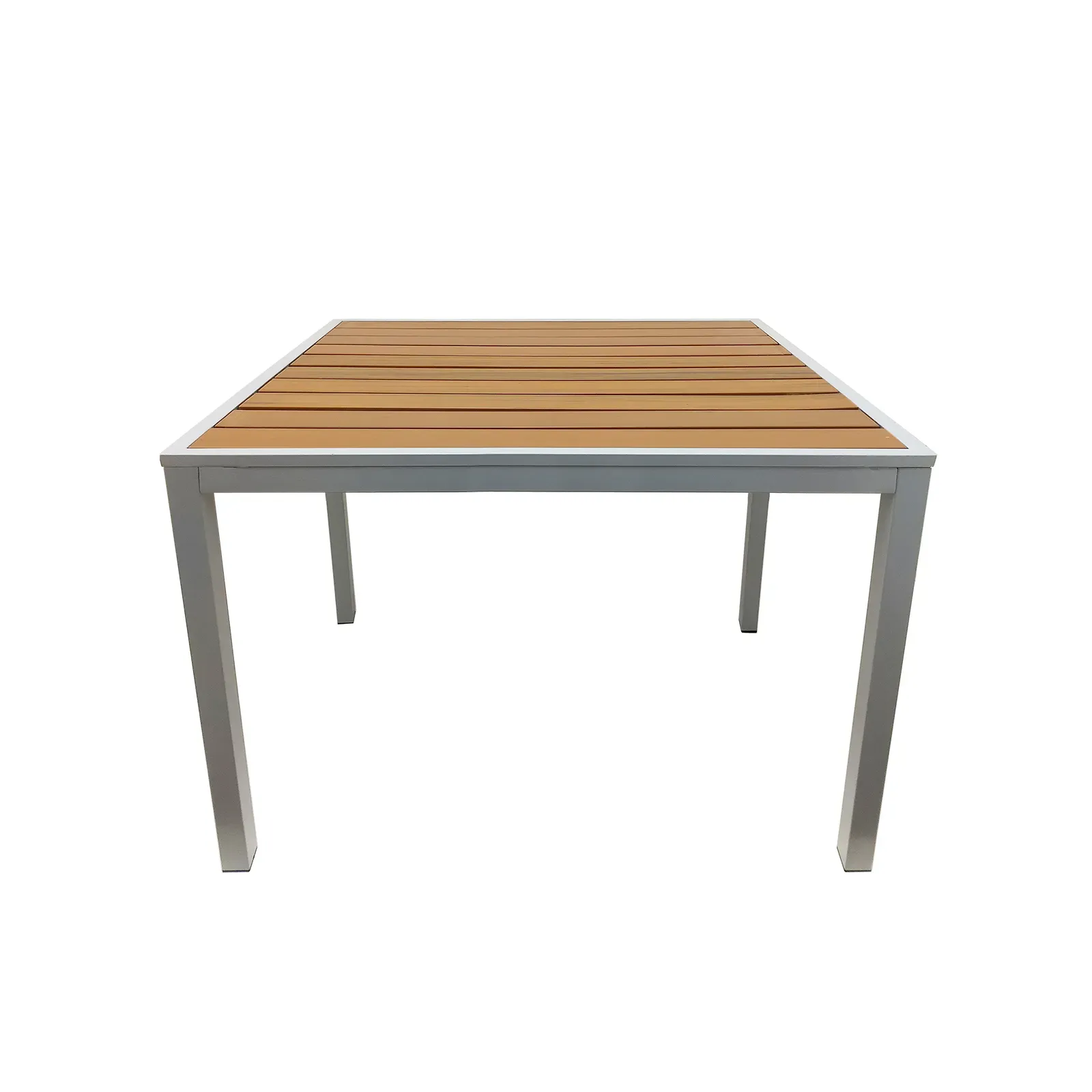 Invest in the exceptional collection of outdoor tables with Oak Street's OD-TK3636. Designed specifically for commercial restaurant use, this teak table is perfect for both indoor and outdoor settings. The square table measures 36" x 36" and features a standard height, making it ideal for dining areas. The synthetic teak plank table top is not only weather resistant but also adds a touch of elegance to any space. The non-marring poly glides ensure that your floors remain protected, while the e-coated frame with a silver powder coat finish adds durability and style. With its exceptional quality and design, the Oak Street OD-TK3636 is the perfect addition to any commercial restaurant, providing a stylish and functional dining experience for your customers.