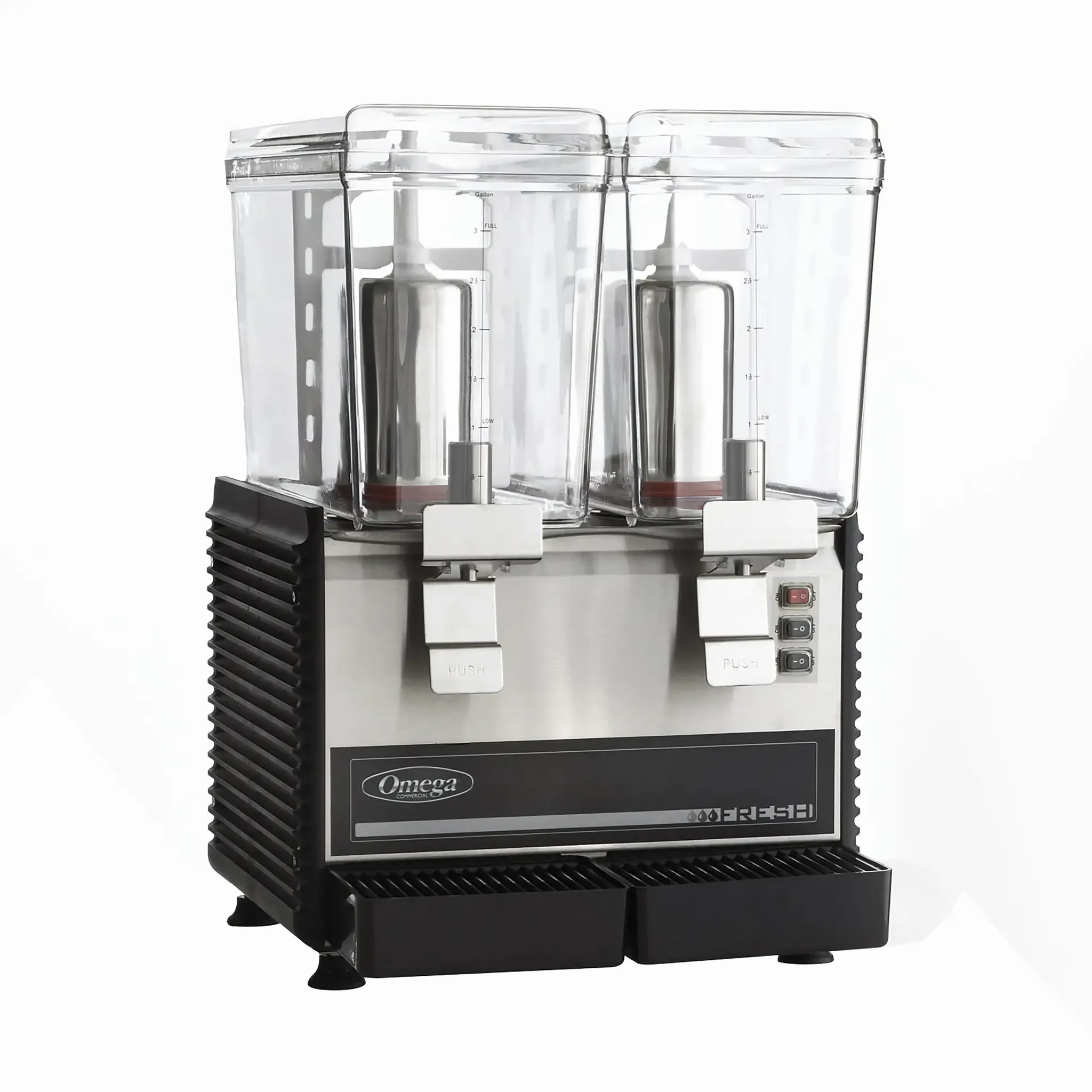 Introducing the Omega OSD20 Beverage Dispenser. Designed for commercial restaurant use, this compact drink dispenser is a must-have for any establishment. With its two 3-gallon polycarbonate containers, you can offer a variety of refreshing beverages to your customers. The extra-large cooling pump and evaporator ensure that your drinks stay chilled and ready to serve. The rotary system and non-drip dispensing mechanism make it easy to pour drinks without any mess. The removable drip tray allows for easy cleaning and maintenance. Made with a stainless steel cylinder, frame, and front panel, this dispenser is built to withstand the demands of a busy restaurant. Powered by a 1/3 HP motor, this dispenser is reliable and efficient. Trust Omega for all your beverage dispensing needs.