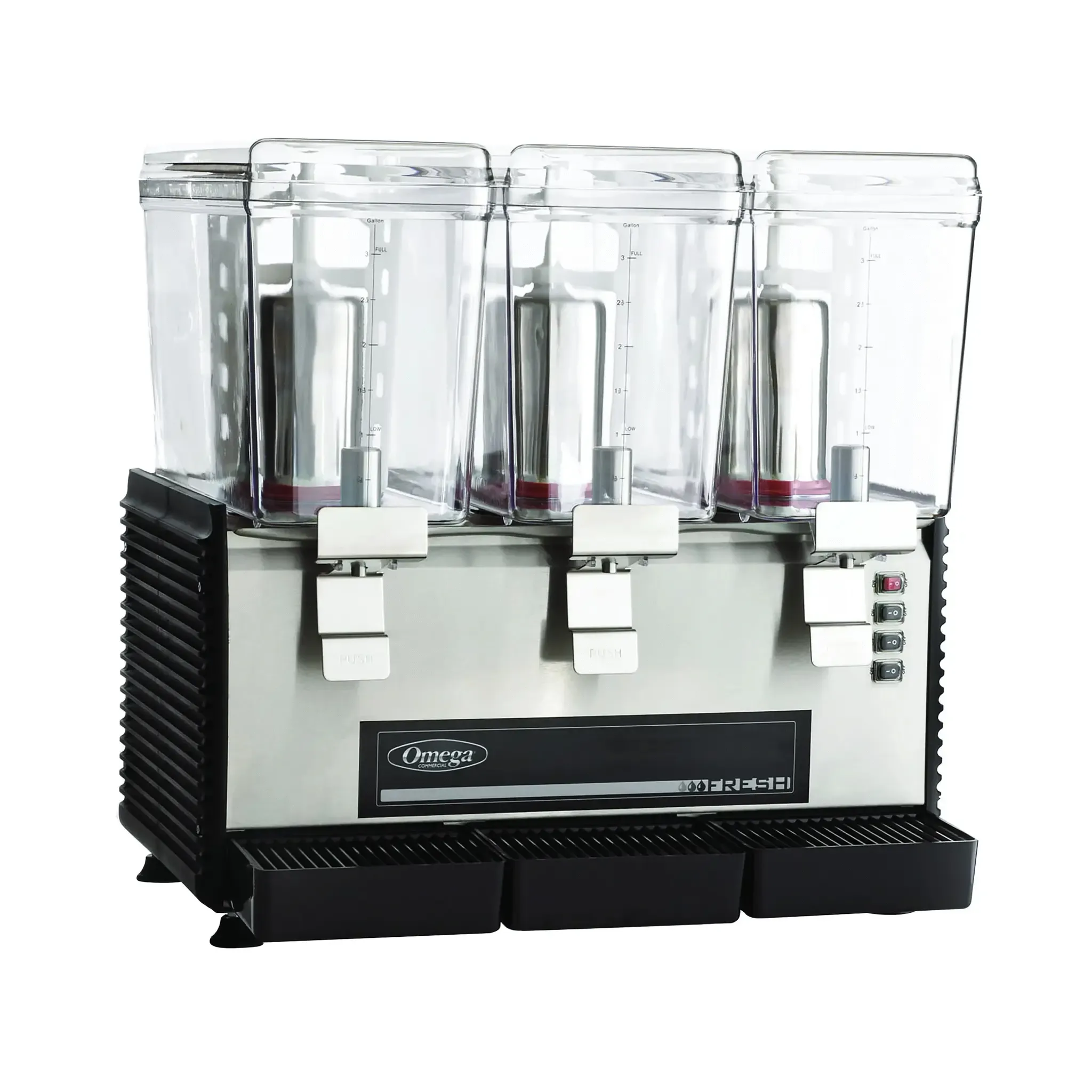 Effortlessly cater to diverse beverage demands with the Omega OSD30 Electric Cold Beverage Dispenser, ensuring seamless drink blending at your commercial establishment. This compact, high-performing dispenser by Omega is tailored for restaurant use, featuring three 3-gallon polycarbonate containers for versatile beverage serving. Its extra-large cooling pump and evaporator guarantee consistent chilling, maintaining drinks at optimal serving temperatures. Experience mess-free dispensing with the rotary system and non-drip mechanism, facilitating easy pouring without wastage. Crafted with stainless steel components, including the cylinder, frame, and front panel, this dispenser ensures both durability and a sophisticated appearance. The 1/3 HP motor powers this efficient dispenser reliably. Be it iced tea, lemonade, or fruit punch, trust the Omega OSD30 Beverage Dispenser to effortlessly meet all your beverage service needs.