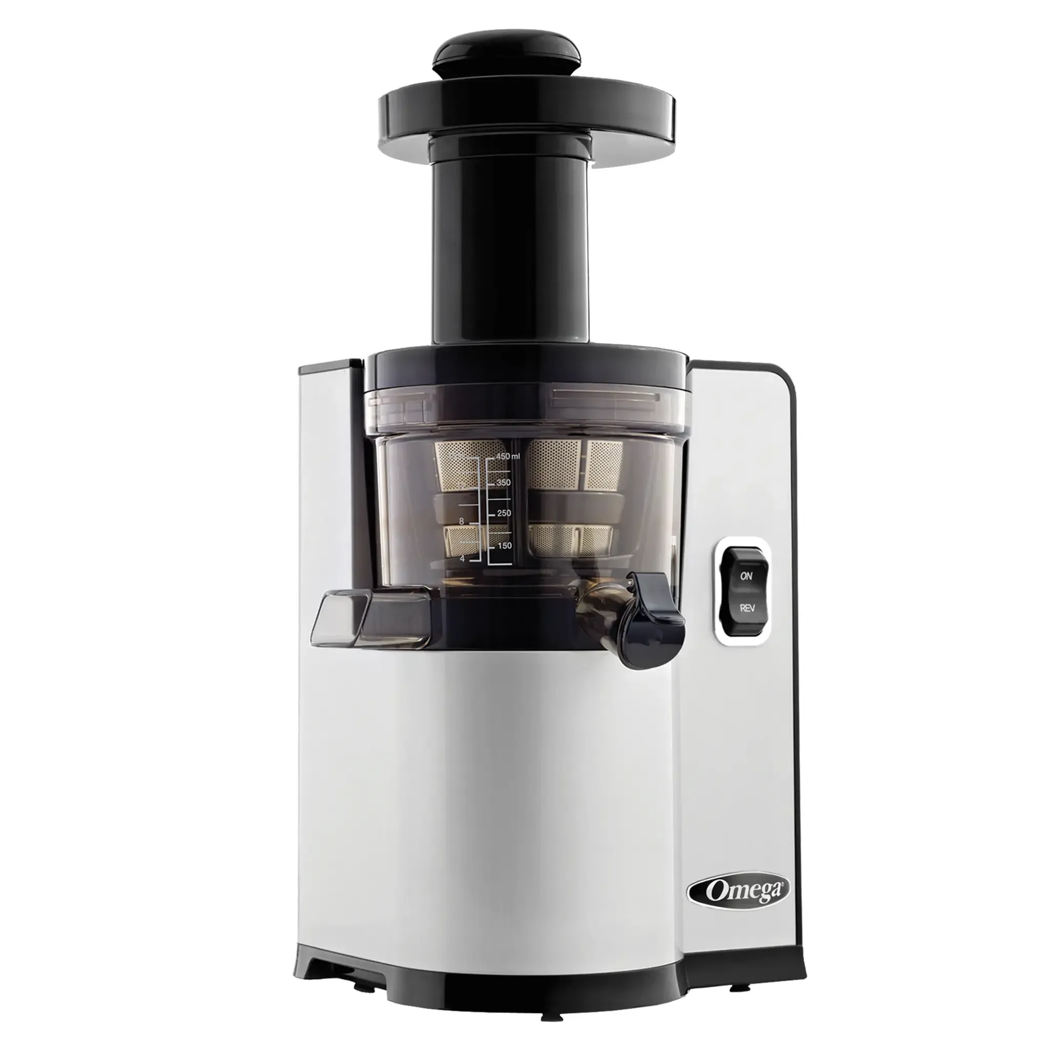 Optimize your beverage service with the Omega VSJ843QS Electric Juicer, designed for efficient juicing in commercial restaurant settings. This robust juicer operates at a low speed of 43 RPM, maximizing juice extraction from various fruits and vegetables. Equipped with a heavy-duty juicing screen and dual-edge auger, it ensures thorough and efficient juicing consistently. The juice flap and mixing function allow for customizable juice blends, catering precisely to your customers' preferences. Enjoy hassle-free cleaning with the auto-cleaning system and reverse mode, saving valuable time and effort. Its quiet operation maintains a tranquil environment for patrons. The sleek silver and black plastic housing add an elegant touch to your restaurant's countertop. Boasting a 1/5 HP motor and 150 watts of power, the Omega VSJ843QS Electric Juicer is a dependable and efficient asset for any commercial kitchen