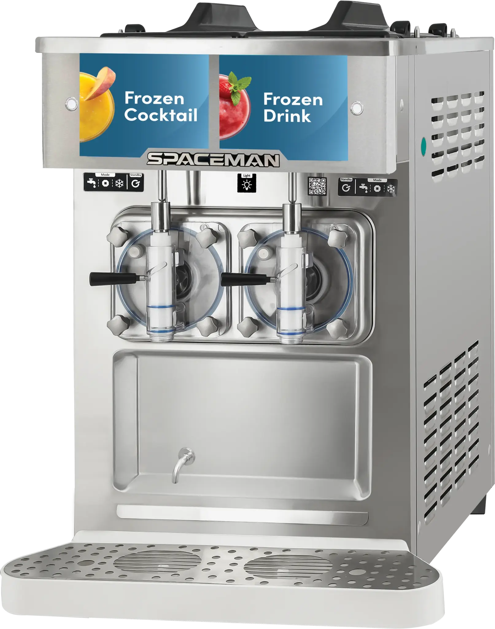 The 6455-CL is a 115-volt countertop two-flavor frozen beverage machine designed for speed, efficiency, and menu flexibility. With patented freezing technology, it achieves quick freeze and recovery times, efficient cooling, and lower energy use per serving compared to competitors. Pre-cooling in the hopper chills product before it enters the freezing cylinder, improving freeze-down time and providing food safety approval for storing product overnight, including dairy-based mixes. Dual controls allow operators to serve two different products simultaneously, making it easy to offer a wide variety of frozen beverages such as smoothies, frozen coffee drinks, margaritas, or cocktails. Its low evaporator temperature also enables the 6455-CL to freeze alcoholic beverages with ease—ideal for margaritas, frosé, and other frozen cocktails. At the heart of its performance is Spaceman’s patented 100% Controlled Contact Flooded Evaporator, engineered for maximum efficiency and delivering the industry’s fastest freeze-down and recovery times. This innovation produces smaller ice crystals for the smoothest, creamiest mouthfeel. Continuous improvements in design, based on operator feedback and R&D, enhance reliability, structural integrity, and long-term serviceability. The single-piece V3 auger combines the drive shaft and auger into one solid over-molded plastic and steel assembly, reducing parts, simplifying cleaning, and enhancing product quality. By scraping the cylinder walls with precision and controlling product flow, it creates smaller ice crystals and consistently smooth frozen drinks. The overhead design also allows operators to switch products and hardness levels in under 30 seconds, while a 1–6 consistency setting makes it easy for multi-unit operators to maintain uniform product quality across locations. Operator-friendly enhancements include an RGB display with a low-level indicator light that flashes red when mix is running low, and a low-mix freeze protection system that automatically switches the machine to standby mode to prevent freeze-ups when product runs out. Backlit virtual merchandising adds a high-visibility illuminated display area with interchangeable flavor cards, offering excellent branding and marketing opportunities with dimensions available for custom designs. Durable, versatile, and efficient, the Spaceman 6455-CL is the perfect solution for operators looking to expand their beverage menus with consistent, high-quality frozen products.