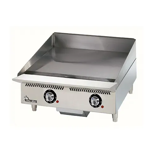 Ignite culinary passion with the Star 824TA Gas Countertop Griddle. This high-quality griddle is a must-have for any commercial restaurant. With a 24" x 24" cooking surface and a 1" thick steel griddle plate, it provides ample space for cooking a variety of dishes. The embedded mechanical snap-action thermostat ensures precise temperature control from 150 to 550 degrees Fahrenheit, allowing you to achieve perfect results every time. The 4-3/8" tapered wrap-around splash guard and 3-1/2" front grease trough help to keep your workspace clean and organized. The heavy-duty metal knobs and welded steel frame with a stainless steel exterior ensure durability and longevity. With 60,000 BTU of power, this griddle can handle even the busiest of kitchens. Made in the USA and cULus and UL EPH Classified, the Star 824TA Gas Countertop Griddle is a reliable and efficient addition to any commercial kitchen.