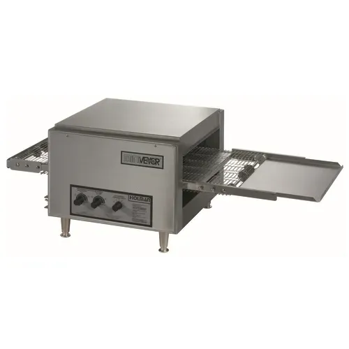 Star’s Holman conveyor ovens are designed to cook a variety of menu items such as fresh dough pizza, blanched pizza, subs, cookies, fish and more quickly and easily while preserving cooking space. The Holman 214HX commercial conveyor oven features analog controls, quartz infrared heaters, and a 14″ wide by 31″ long belt.
