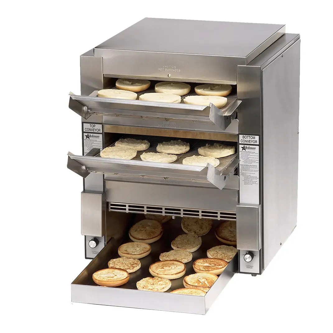 DT14 Double Conveyor Toaster, 208V, 1PH, double-deck design fits two full-size toasters in less than 20" of space, quartz element heaters with individual controls, variable belt speed and top/bottom heat adjustment per deck, top deck adjustable 1"–2.25" entry, 8" load area, lower deck fixed 1.75" opening with 6" load area, forced convection cooling extends life of components, built-in heated holding area, hi-limit switch prevents overheating