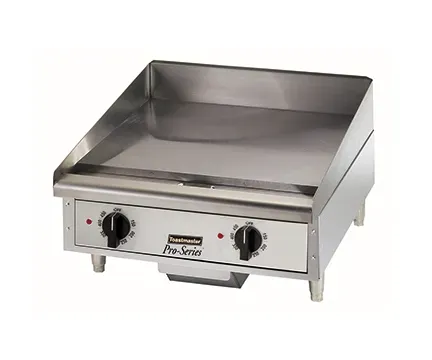 Boost convenience with the Toastmaster TMGM24 Gas Countertop Griddle. Designed for commercial restaurant use, this griddle offers a 24" W x 21" D cooking surface, allowing you to cook multiple items simultaneously. The 3/4" thick ultra-smooth polished steel plate ensures even heat distribution and excellent heat retention, while the (2) independent cooking zones provide flexibility and efficiency. With manual controls, you have full control over the cooking process. The front grease trough and chute, along with the side and rear splash guards, make cleaning a breeze. The griddle also features a pressure regulator and 4" nickel-plated steel legs for stability. Made in the USA, this griddle is cULus and UL EPH certified, guaranteeing its quality and safety. Whether you're cooking pancakes, burgers, or stir-fry, the Toastmaster TMGM24 Gas Countertop Griddle is a reliable and efficient addition to any commercial kitchen.