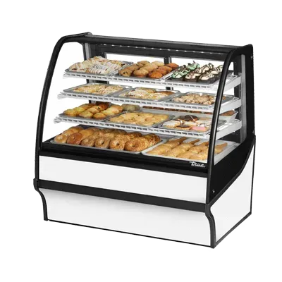Cook with precision using the True Manufacturing TDM-DC-48-GE/GE-S-W Display Case. This non-refrigerated bakery display merchandiser is designed to showcase your delectable treats in a stylish and efficient manner. With its curved glass front and glass sides, customers will be enticed by the enticing display of your baked goods. The two rear sliding glass doors make it easy for staff to access and restock the shelves, which are made of adjustable white PVC coated wire. The three tiered levels provide ample space to showcase a variety of pastries, cakes, and breads. The LED interior lighting illuminates your products, making them even more enticing to customers. Made in the USA with a stainless steel exterior and white powder coated interior, this display case is not only durable but also easy to clean. With its CE, cULus, and UL EPH Classified certifications, you can trust in its quality and safety. Upgrade your bakery with the True Manufacturing TDM-DC-48-GE/GE-S-W Display Case and watch your sales soar.